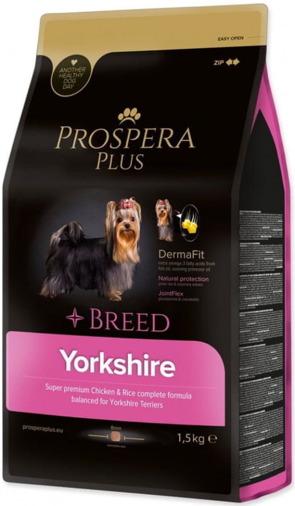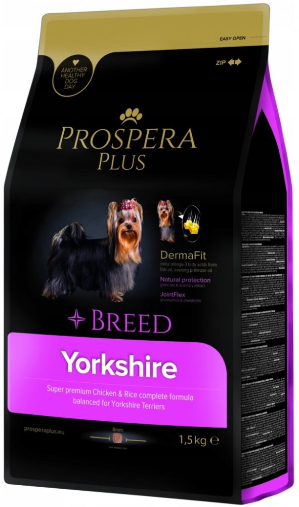 PROSPERA PLUS Yorkshire je superpremiové krmivo, navržené s ohledem na unikátní výživové potřeby plemene Yorkshirský teriér. Základem receptury je kvalitní lehce stravitelné kuřecí maso doplněné o rybí tuk (omega 3 mastné kyseliny) a pupalkový olej, které podporují zdravou srst tohoto plemene. Funkční přísady extrakt ze zeleného čaje a rozmarýnu posilují imunitu pejsků. Chondroprotektiva glukosamin a chondroitin pomáhají posilovat a stabilizovat kosti a klouby.Speciální tvar granulí pomáhá k prevenci před zubním kamenem a plakem.