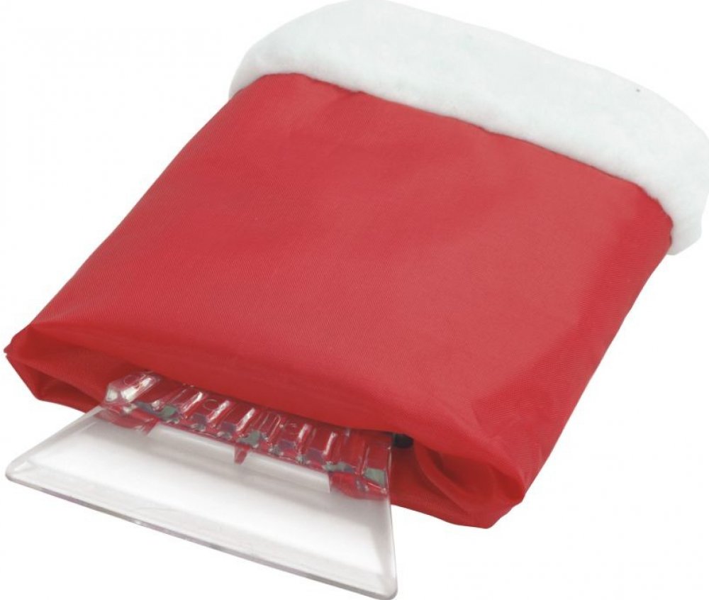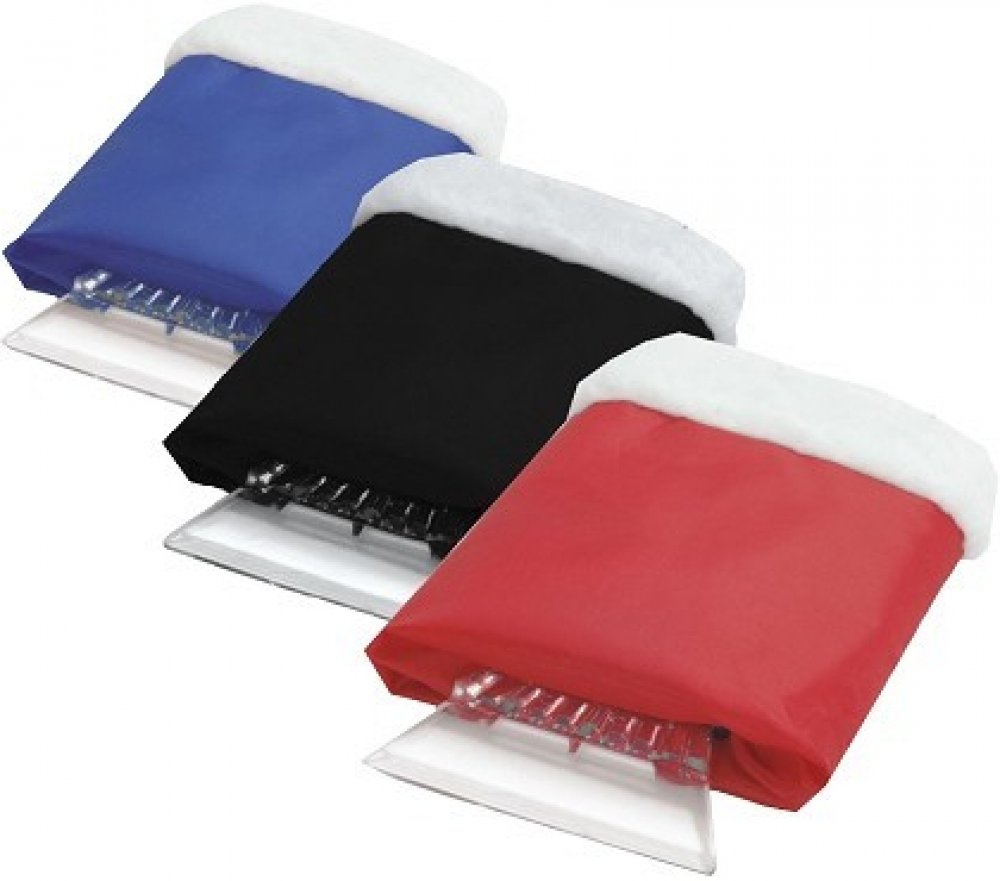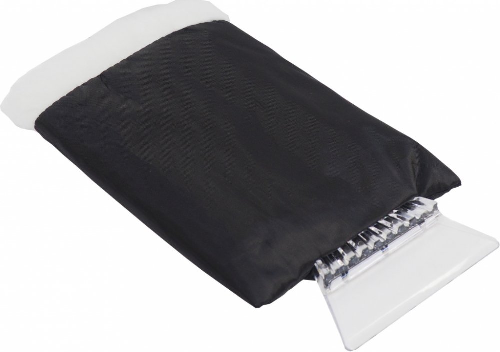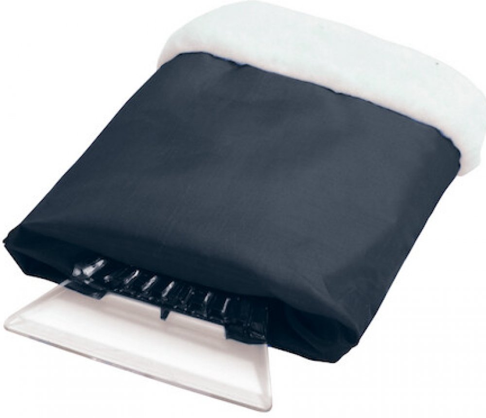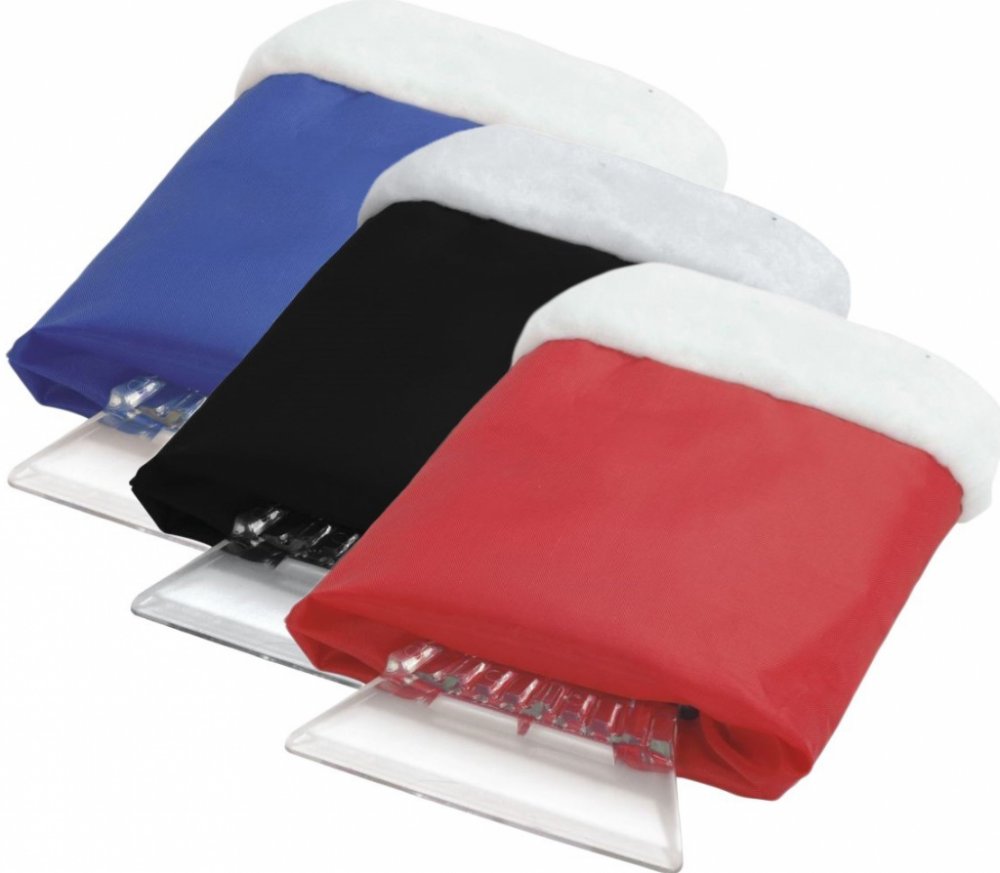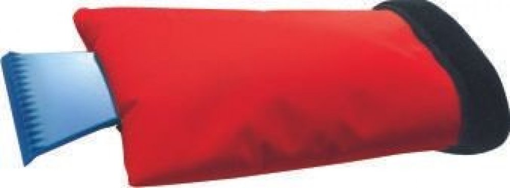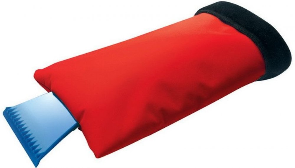 Škrabka pro odstraňování sněhu a ledu z automobilových skel doplňená zateplenou rukavicí.