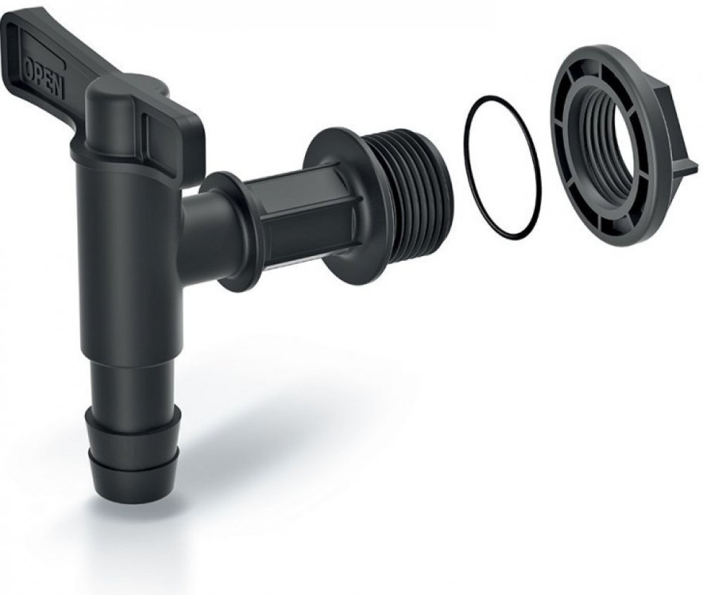 Kohoutek pro nádrže na dešťovou vodu ICAN, RAICAN, AQUACAN, WOODCAN, CANYON, WATERFORM, TOWER STONE. Sada se skládá ze tří prvků: kohoutek, těsnění, matice. Na výstup kohoutku lze připojit zahradní hadicí s vnitřním průměrem 18 mm.