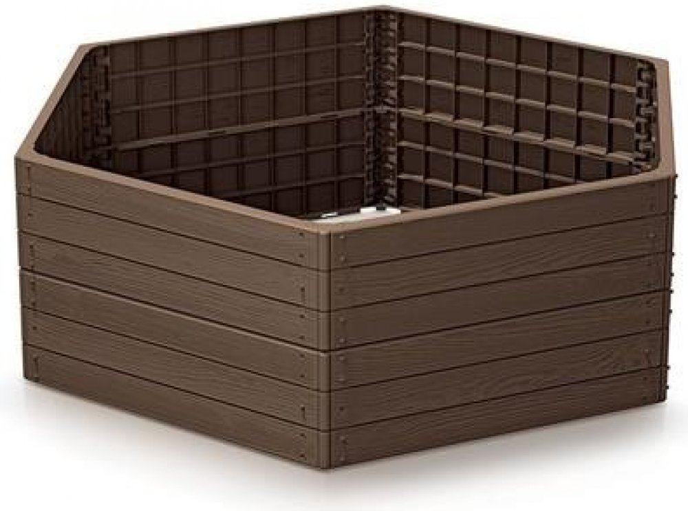 Vyvýšený záhon v hnědé barvě, z plastu, struktura dřeva, možnost stohování záhonů na sebe, bez dna, menší výskyt plevele, pohodlnější péče o rostliny, využití i jako dekorativní prvek na zahradu.