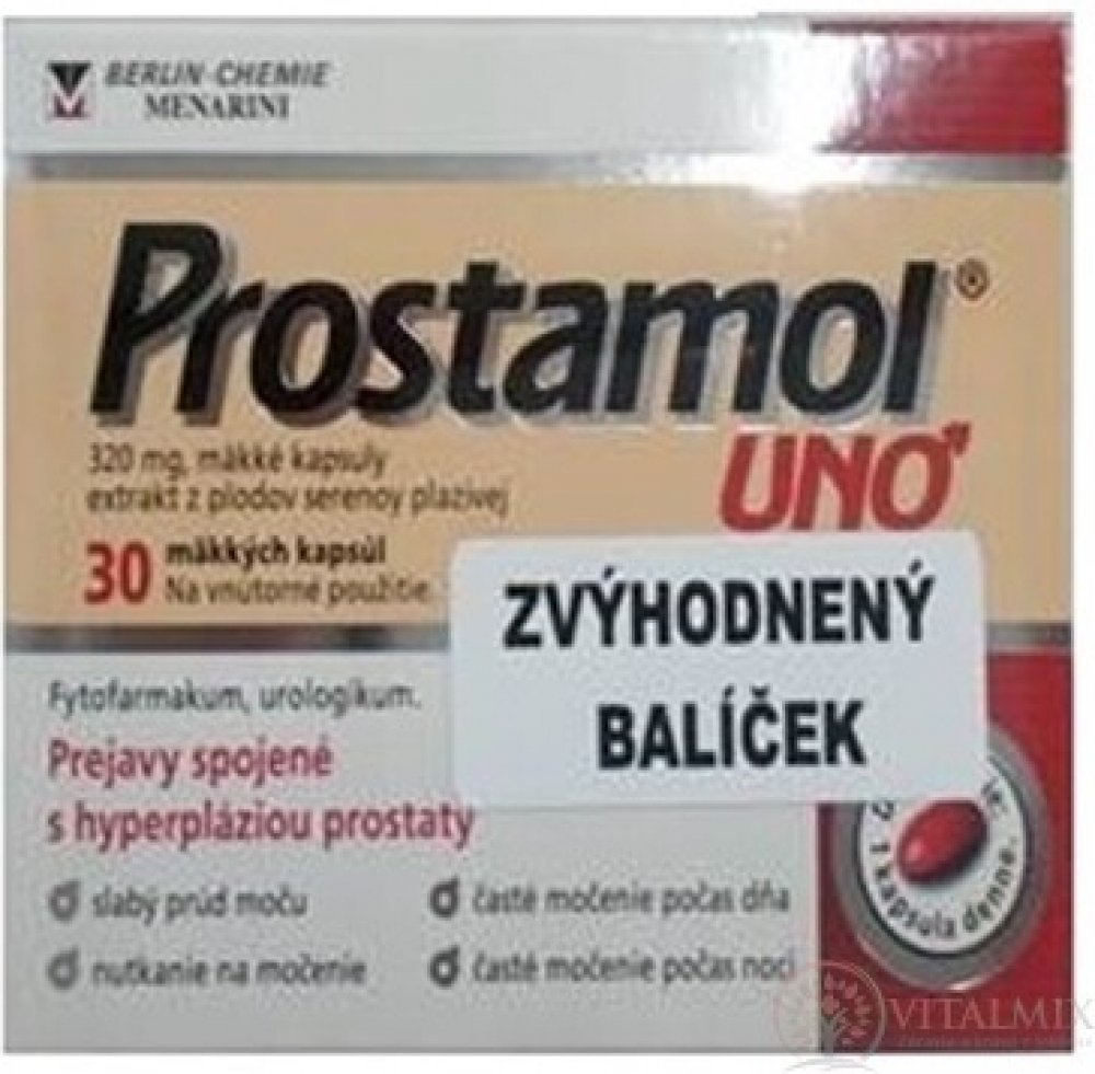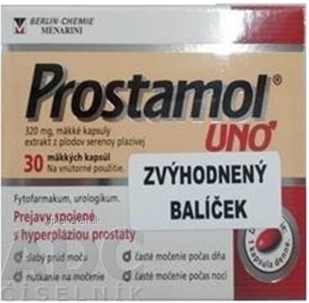 Jedná se o skupinové balení 2 produktů, tato verze balení nemá přidělen ŠÚKL Kód. Balení fixuje dva léky, které jsou samostatně registrovány: Prostamol uno cps 320 mg 1x60 ks (SCOL kód 59711, Reg.číslo 94 0065 00-S) Prostamol uno cps 320 mg 1x30 ks Přípravek obsahuje výtažek z plodů serenoy plíživé (Serenoae repens), je to rostlinný lék na prostatu. Používá se k léčbě potíží s močením (ztížené vyprazdňování močového měchýře) u dospělých mužů při nezhoubném zvětšení prostaty (benigní hyperplazie prostaty, nikoli rakovinného původu) v I. a II. stadiu. Lék působí preventivně proti dalšímu zvětšování tkáně prostaty. Vice na adc.sk
