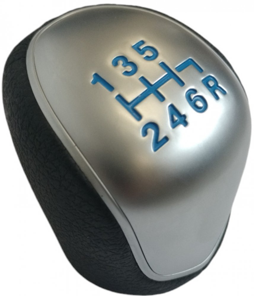 Hlavice řadící páky Ford C-Max od 2007- 6st stříbrná modrá. Závit 12mm. R vpravo dole. Stříbrná hlavice řadicí páky s modrým schématem řazení pro šestistupňové převodovky.