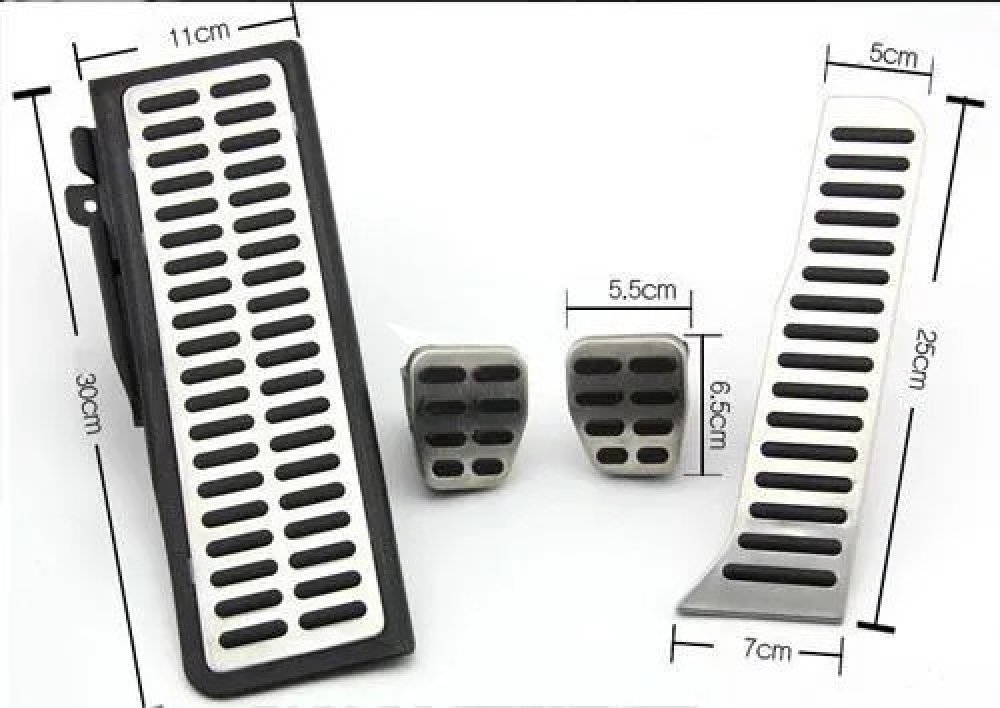 RS sportovní pedály VW Passat B7 2010–2015 manuální.Vyrobeno z nerez oceli.Určeno pro vozy s manuální převodovkou.Sada 4 kusů krytů pedálů.Montáž se provádí nasazením na místo původních obyčejných pryžových krytů pedálů.
