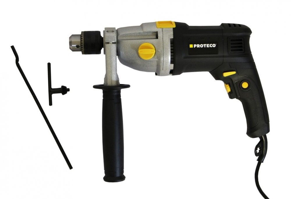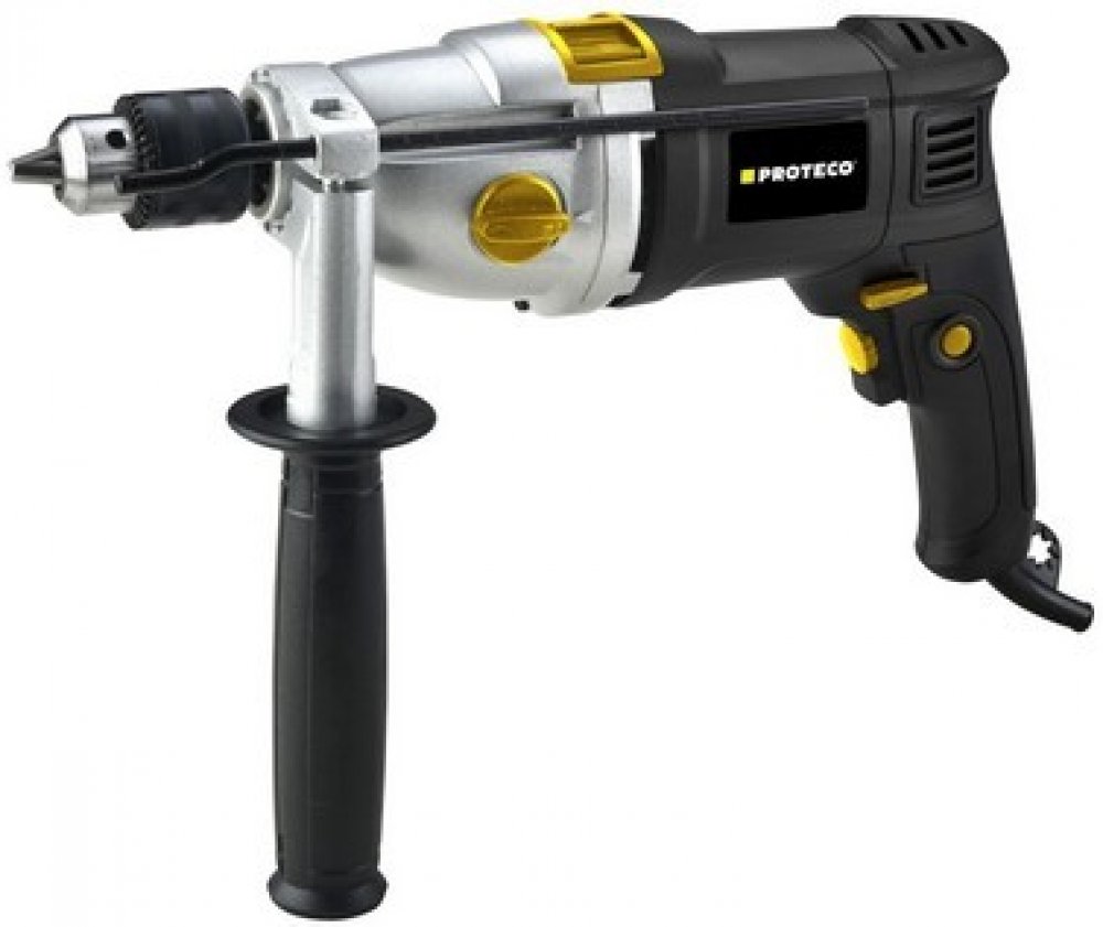 Vrtačka příklepová PROTECO 1050 W 2-rychlostní je perfektním řešením pro všechny řemeslníky a kutily, kteří hledají univerzálního pomocníka při práci v dílně a domě. Splňuje vysoké nároky na provozní spolehlivost, snadnou obsluhu a bezpečnost uživatele. Tato vrtačka s dvourychlostní převodovkou o příkonu 1 050 W dosahuje rychlosti otáček v rozmezí 0-1 100 min-1 nebo 0-3 000 min-1, které můžete plynule regulovat a rychlosti příklepu v rozmezí 0-17 000 úderů/min nebo 0-48 000 úderů/min. Pro vrtání v měkčích materiálech lze příklep vypnout. Vrtačka je použitelná také na šroubování díky možnosti levého i pravého chodu otáčení. Vrtačka si při vrtání do oceli poradí až s 13/16 mm průměrem, do betonu zvládne 13/16 mm průměrem a při vrtání do dřeva až 40/25 mm průměrem. Nejen výkonem, ale také uživatelsky příjemným zpracováním, je tato vrtačka populární. Při delším používání jistě oceníte měkčené držadlo pro zvýšený komfort držení a vyšší bezpečnost. Při využití příklepu se vám jistě bude hodit přídavná rukojeť otočná až o 360° a kvalitní sklíčidlo.