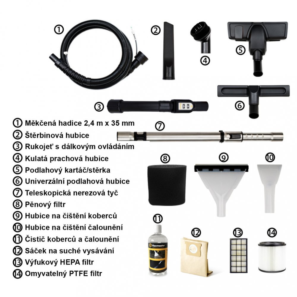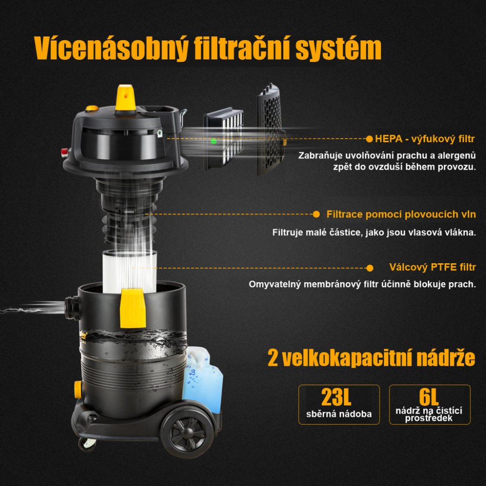 Profesionální čistící stroj; tepování koberců, sedaček i autosedaček; suché a mokré vysávání; výkon 1300 W; objem nádoby 23 l; nádoba na čistící prostředek 6 l; délka přívodního kabelu 10 m; hmotnost 10,8 kg