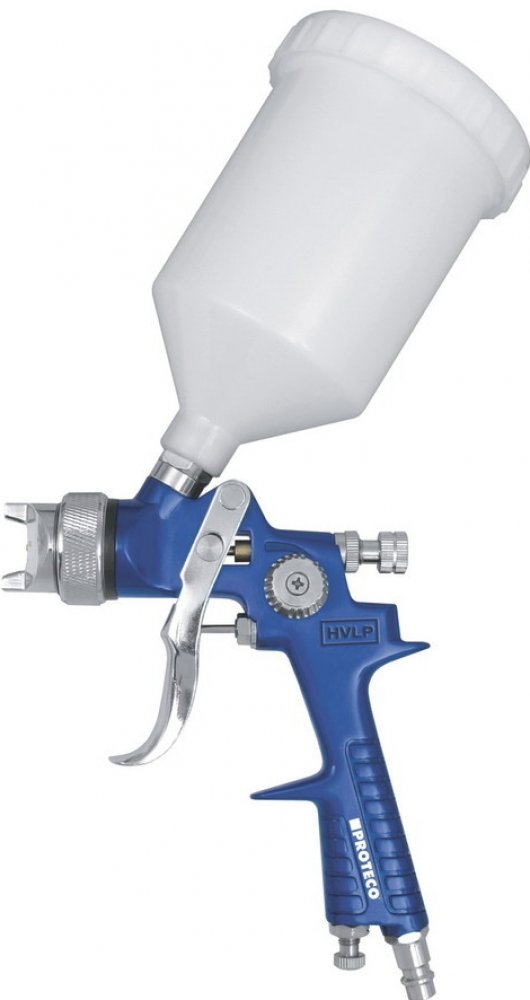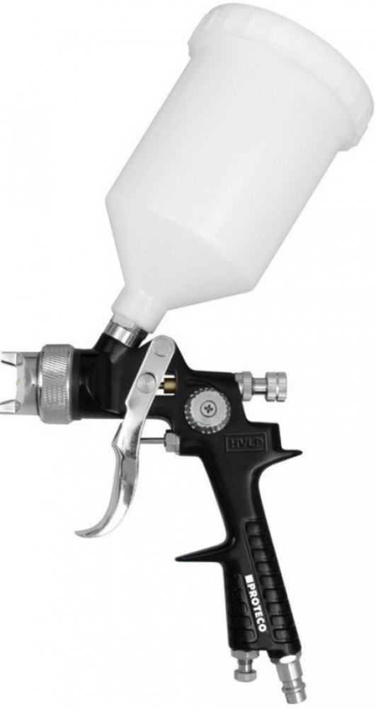 Stříkací pistole s horní nádobkou 600 ml je určena pro stříkání středních a velkých ploch. Je vhodná zejména pro autoopraváře, lakýrníky, nábytkáře, kutily, aranžéry apod. Je možné stříkat různé druhy barev, laky a lazury a to i vodou ředitelné. Pistole má systém HVLP (High Volume Low Pressure). U tohoto systému se k rozprášení barvy používá velké množství vzduchu o nízkém tlaku. Tato metoda se vyznačuje vysokou efektivitou a nízkými ztrátami. Pistole se při správném naředění barvy vyznačuje velmi dobrou kvalitou násřiku. Kužel rozprášené barvy je homogenní a netvoří "hluchá" místa.Tělo pistole je hliníkové. Barvová tryska i jehla jsou z důvodu vysoké životnosti vyrobeny z nerezové oceli. Čelní vduchová tryska s převlečnou maticí je vyrobena z mosazi. Tuto trysku lze otáčet. Je možné tak podle potřeby nastavit horizontální nebo vertikální rozptyl. Po uzavření bočního regulačního ventilu bude mít pistole rozptyl pouze kruhový. Zadním regulačním šroubem lze nastavit chod jehly a regulovat tak množství barvy.