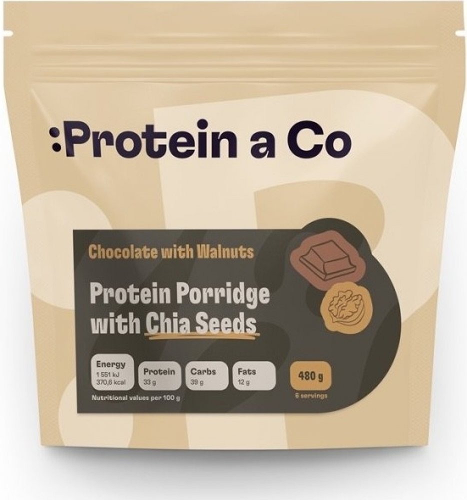 Složení: ovesné vločky (min. 35 %), 80 % syrovátkový koncentrát (min. 25 %), chia semínka (min. 3 %), kakao (min. 1 %), BIO kokosový cukr, sušené mléko, vlašské ořechy (min. 4 %)