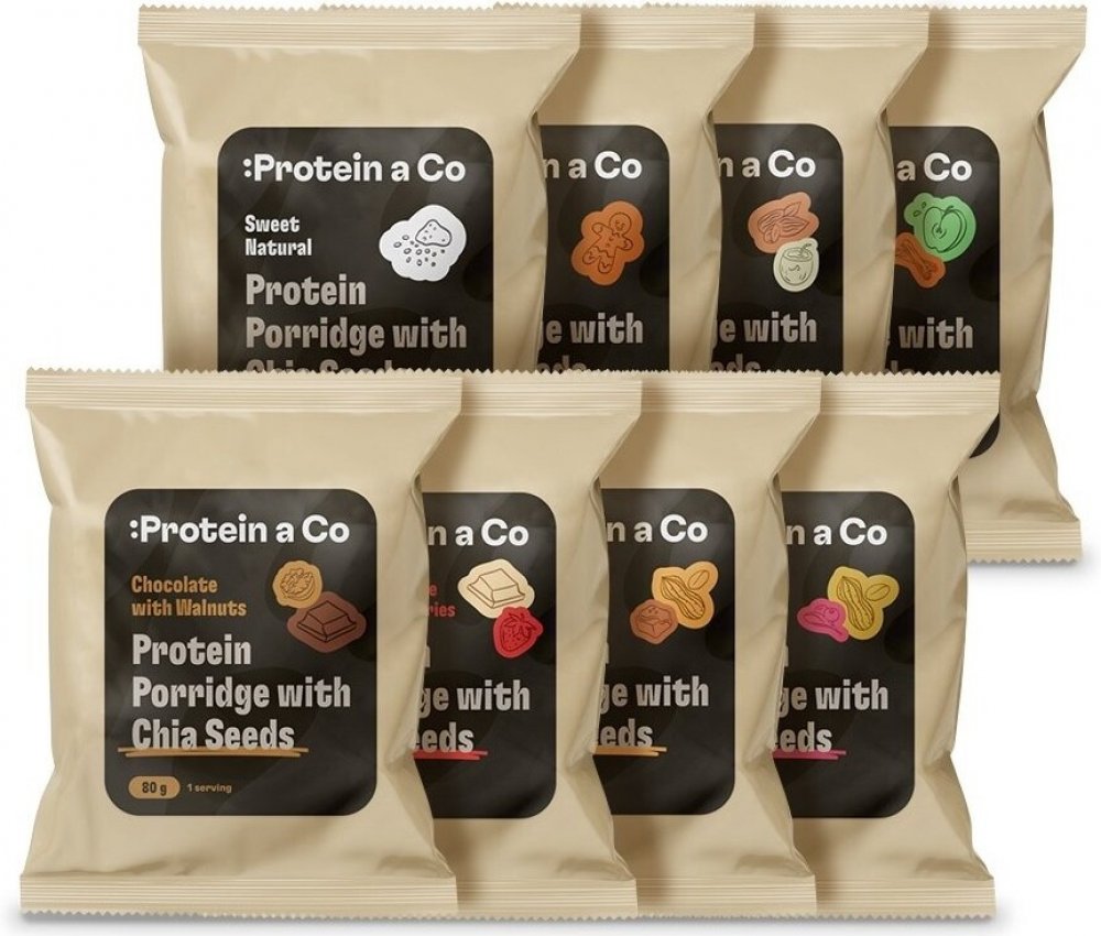 Sweet natural: ovesné vločky (min. 41 %), syrovátkový proteinový koncentrát zpracovaný metodou CFM (emulgátor: slunečnicový lecitin) min. 27 %, sušené plnotučné mléko, kokosový cukr min. 6 %, chia semínka min. 5 %