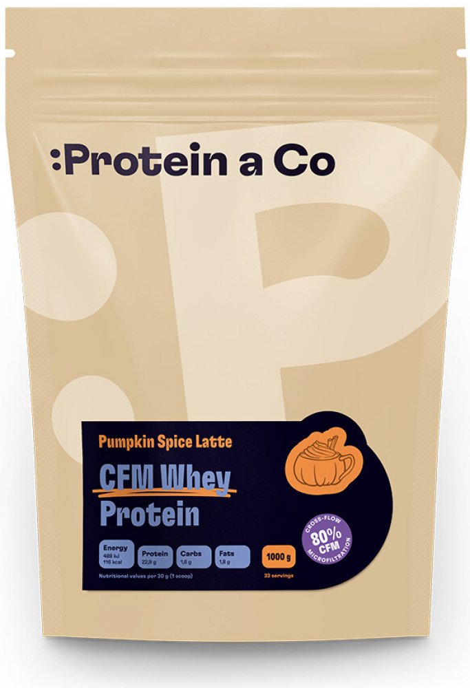 Pumpkin Spice Latte: Syrovátkový proteinový koncentrát zpracovaný metodou CFM (emulgátor: slunečnicový lecitin) min. 83 %, glycin, přírodní aroma, instantní káva min. 1 %, skořice min. 0,2 %, konzervant: sůl kamenná; sladidlo: sukralóza; komplex trávicích enzymů Opti-7-Digest [amyláza, laktáza, proteáza, lipáza, celuláza, bromelain, papain].