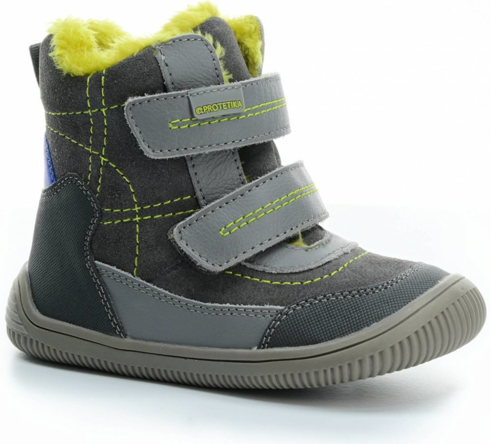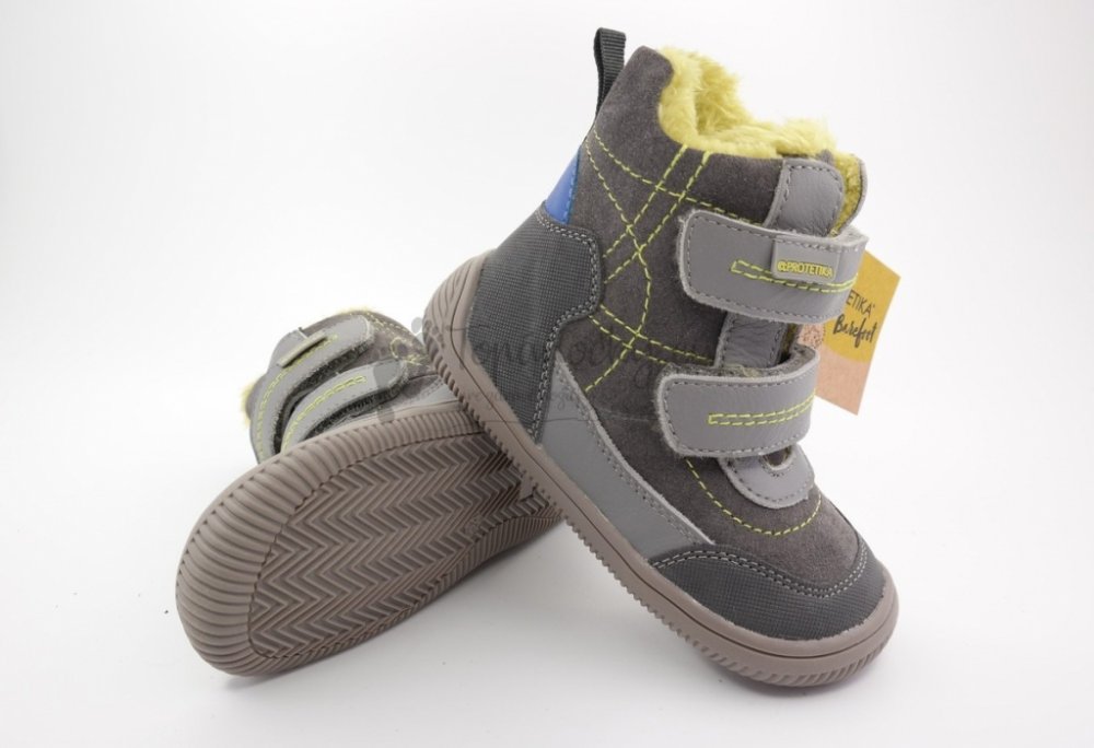 Pohodlné kožené barefoot zimní botky RAMOS GREY pro kluky. Vhodné pro každodenní nošení. Svršek obuvi tvoří kombinace hladké a broušené kůže spolu se syntetickým materiálem na špici a patě. Obuv je zateplená umělým kožíškem. Anatomicky tvarovaná vyjímatelná fleecová stélka bez podpory klenby. Flexibilní podešev podporující přirozenou valivost chodidla. Zvýšený okop na špičce boty chrání obuv před ...