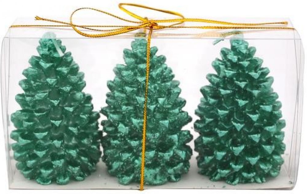 Sada 3 ks vánočních svíček ve tvaru šišky. Hodí se na každý vánoční stůl, kde navodí tu pravou sváteční atmosféru. Materiál - parafín. Barva zelená. výška - 7 cm šířka - 3,5 cm