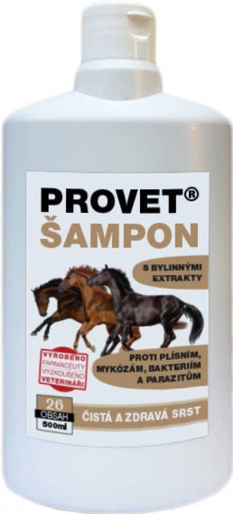 PROVET® VETERINÁRNÍ ŠAMPON s extraktem rostlin Tabebuia impetiginosa (Lapacho) a Azadirachta indica zlepšuje vzhled a elasticitu srsti a kůže, podporuje růst srsti. Účinné látky obsažené v těchto rostlinách mají výrazný protiplísňový, antialergický, antiparazitární a antibakteriální (vč. Staphylococcus aureus, Staphylococcus epidermidis), antimykotický, antiseptický a protizánětlivý efekt. Zajišťuje optimální mastnost a ideální pH. Je vhodný pro všechny typy srsti. Použití tohoto šamponu je vhodné pro jedince s problematickou kůží se sklonem k vypadávání srsti při plísňových a bakteriálních onemocnění kůže a ekzémech i pro běžné mytí. Díky vynikajícím kvalitám šampon vyhovuje všem věkovým kategoriím a typům koní. Nedráždí a nemění barvu srsti. Aplikace: Přípravek naneste na mokrou srst, vmasírujte, nechte 10 minut působit a opláchněte. U problematické kůže nebo srsti aplikujte denně do vymizení příznaků. Šampon je vhodný i pro běžné mytí zdravé srsti. Číslo schválení: 092-19/C