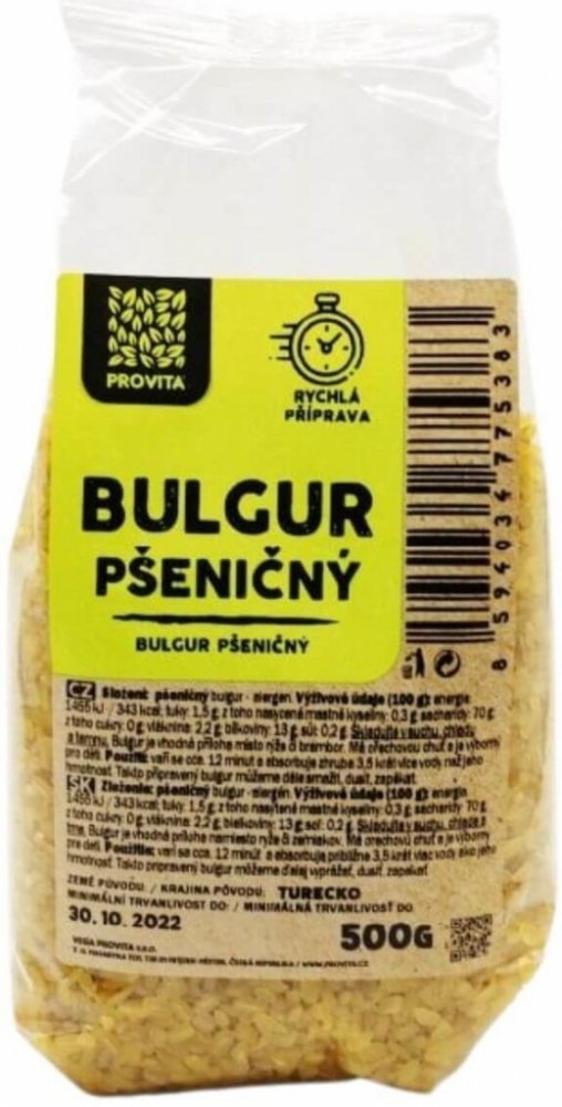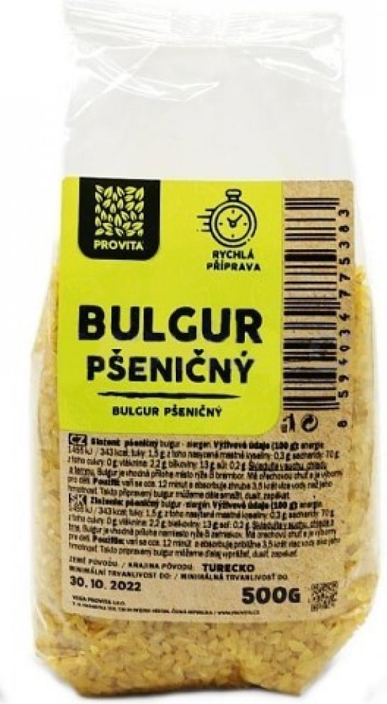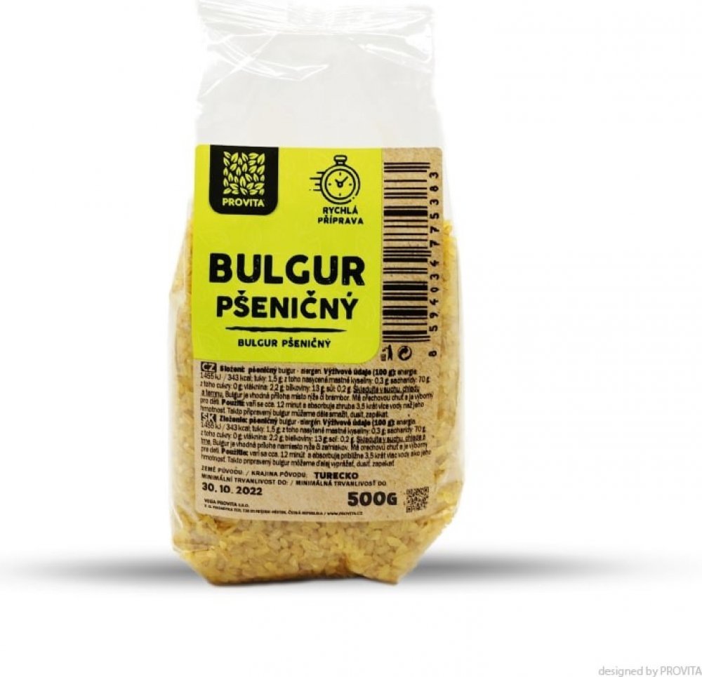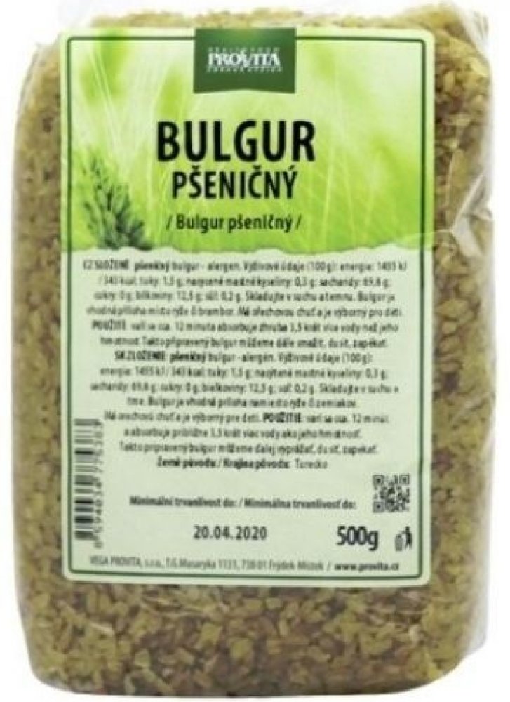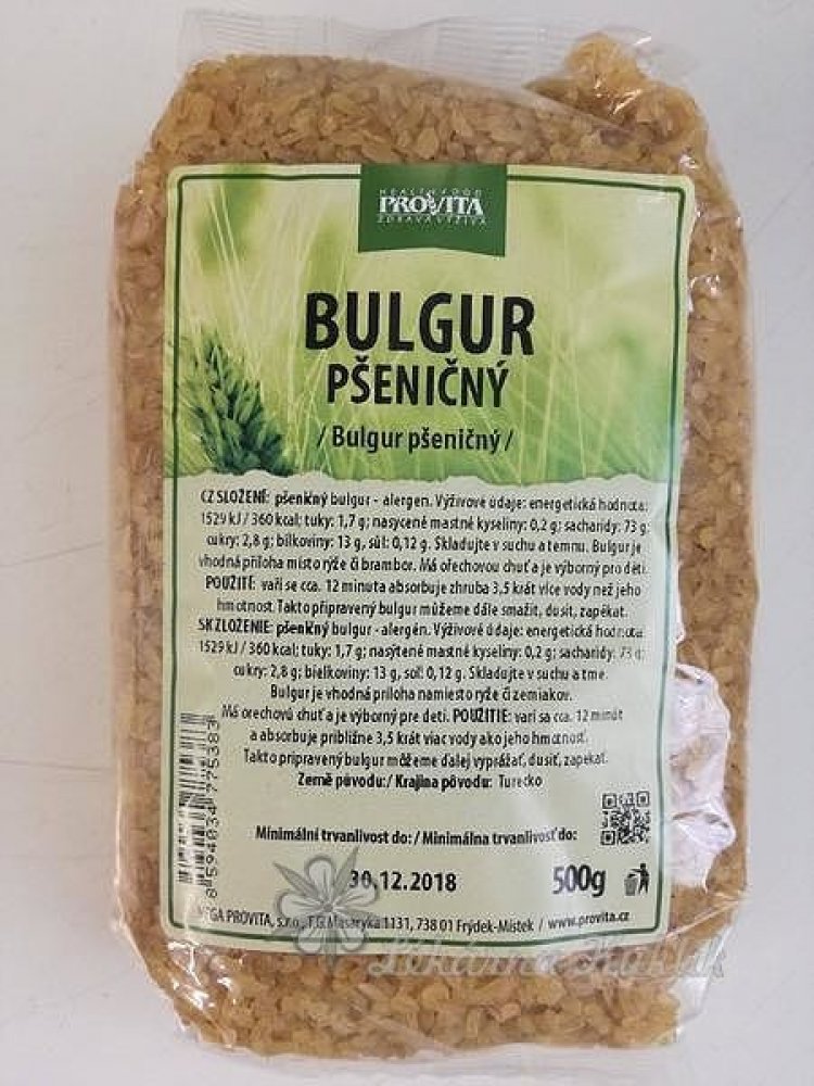 Použití: Bulgur vložíme do hrnce a zalijeme vroucí vodou po okraj bulguru, osolíme a povaříme na mírném ohni 5-7 minut. Většina vody se do té doby vsákne, pokud by bylo přebytečné vody mnoho, bulgur scedíme. Hrnec odstavíme z ohně, přiklopíme poklicí a necháme ještě 5-10 minut dojít, dokud bulgur zcela nezměkne. Takto připravený bulgur můžeme dále smažit, dusit, zapékat....