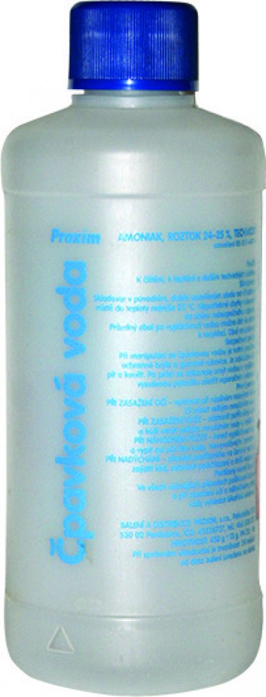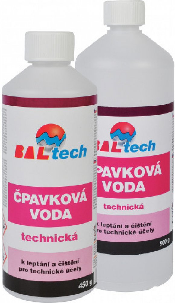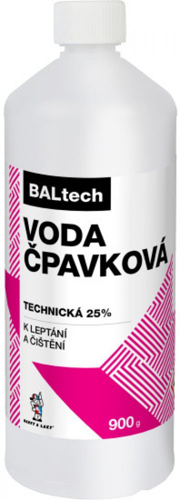 Čpavková voda se používá k čištění, leptání a dalším technickým účelům. Čpavková voda technická je roztok syntetického čpavku ve vodě. Je to žíravá kapalina pronikavého zápachu, silné zásadité reakce, bezbarvá až nažloutlá, někdy slabě zakalená. Vlastnosti čpavkové vody: Jde o roztok syntetického čpavku ve vodě. Žíravá kapalina štiplavého zápachu. Používá se nejen k čištění ale i různým technickým účelům. Při jeho použití dbejte na to, aby byl prostor dobře větraný a vy měli dostatečný přísun čerstvého vzduchu! Při manipulaci s ním vždy používejte ochranné rukavice a brýle! Použití čpavkové vody BALTECH: čpavková voda se používá k různým průmyslovým účelům k čištění k leptání na oxidaci povrchu nových zinkových povrchů plechů a okapů a dalším technickým účelům. Příklad použití: Čpavková voda se také používá na oxidaci povrchu nových zinkových povrchů plechů a okapů – na čerstvém povrchu totiž barva neulpívá rovnoměrně, ale vytváří fleky. Tímto postupem „zestaříme“ čerstvý zinek, takže posléze na něm již barva bude držet normálně, a povrch bude dobře očištěný: 2–3% roztokem čpavkové vody (25% čpavkovou vodu zředíme s vodou v poměru 1 díl čpavkové vody a 10 dílů vody, můžeme přidat i saponát, zhruba 5 ml / litr) omýt plochu, kterou chceme natírat, nechat přibližně 10 minut působit, až vytvoří kovově zašedlý povrch, který následně opláchneme čistou vodou. Po vyschnutí můžeme začít natírat barvou. Roztok je toxický, stejně jako oplachová voda, likvidovat dle návodu výrobce. K zakoupení v drogériích. Bezpečnostní upozornění GHS05 - korozivní a žíravé látky GHS07 - dráždivé látky GHS09 - látky nebezpečné pro životní prostředí Signální slovo: Nebezpečí Obsah nebezpečných látek amoniak, roztok...% (Index: 007-001-01-2; CAS: 1336-21-6). H314 Způsobuje těžké poleptání kůže a poškození očí. H335 Může způsobit podráždění dýchacích cest. H400 Vysoce toxický pro vodní organismy. P102 Uchovávejte mimo dosah dětí. P260 Nevdechujte prach/dým/plyn/mlhu/páry/aerosoly. P261 Zamezte vdechování prachu/dýmu/plynu/mlhy/par/aerosolů. P303+P361+P353 PŘI STYKU S KŮŽÍ (nebo s vlasy): Veškeré kontaminované části oděvu okamžitě svlékněte. Opláchněte kůži vodou/osprchujte. P305+P351+P338 PŘI ZASAŽENÍ OČÍ: Několik minut opatrně vyplachujte vodou. Vyjměte kontaktníčočky, jsou-li nasazeny a pokud je lze vyjmout snadno. Pokračujte vevyplachování. P310 Okamžitě volejte TOXIKOLOGICKÉ INFORMAČNÍ STŘEDISKO/lékaře/ tel. 224919 293 nebo 224 915 402 (24 hodin denně) P405 Skladujte uzamčené. P501 Odstraňte obsah/obal dle instrukcí na výrobku