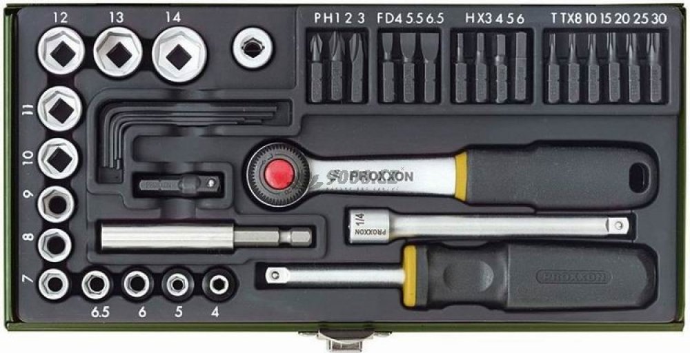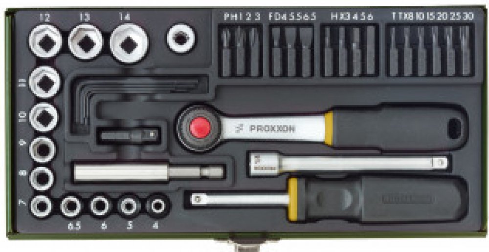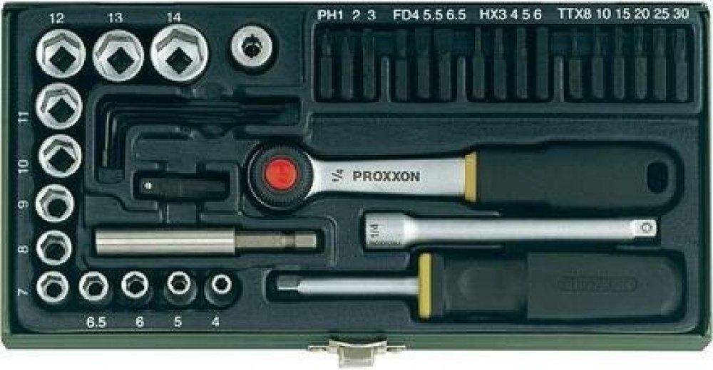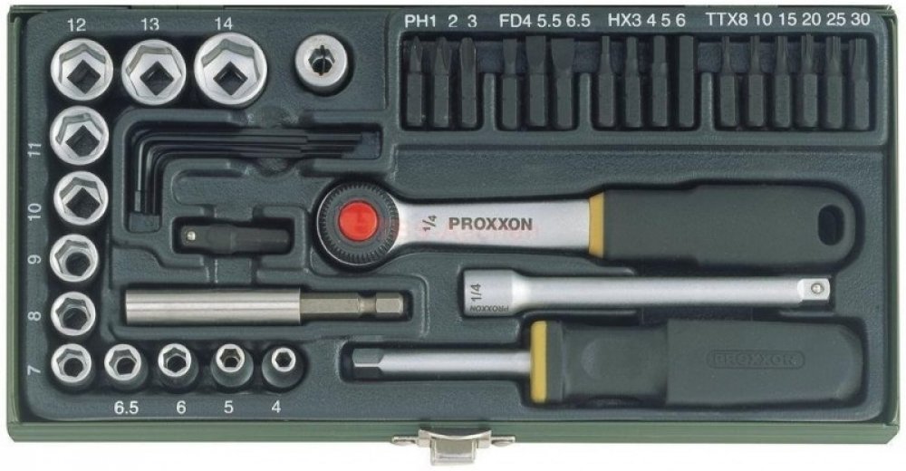 * Sada šroubováková s magnet. držákem 1/4" - 39 dílů * Vyrobeno z chrom-vanadiové oceli 31 CrV 3. Tisícekrát dílensky prověřeno. * Kompletní 39-dílná sada obsahuje nástrčné 6hranné hlavice pro 1/4" od 4 - 5 - 6 - 6,5 - 7 - 8 - 9 - 10 - 11 - 12 - 13 - 14mm (12ks). Prodloužovací nástavec délky 100mm. Úhlové Inbus klíče 1,25 - 1,5 - 2 - 2,5 a 3 mm. Rukojeť 1/4" šroubováku s vnitřním čtyřhranem v rukojeti. Dále sada obsahuje 16ks standardních bitů délky 25mm Phillips PH 1 - 2 - 3 Plochý FD 4 - 5,5 - 6,5mm Inbus HX 3 - 4 - 5 - 6mm Torx s vnitřním otvorem TTX 8 - 10 - 15 - 20 - 25 - 30. Dále magnetický držák bitů, adaptér pro použití hlavic ve vrtačce a adaptér pro bity. Součástí sady je standardní 1/4" ráčna s tlačítkem pro rychlé uvolnění hlavice (bližší informace naleznete pod objednacím číslem 23092). * Hlavice jsou vykované z oceli 31CrV. Vysoký obsah uhlíku, zaručuje velkou tvrdost. Hluboký vnitřní šestihran má v celém profilu přesný rozměr, což zajistí, že vysouvání matic nedělá problémy. Tenké stěny hlavic usnadňují těžkou práci na nepřístupných místech. Skosení horní hrany ulehčuje nasazení na hlavu šroubu. Ve čtyřhranu jsou vyfrézované drážky, zabezpečující pevné uchycení na ráčně. Hlavice od velikosti 19mm mají odlehčené konce umožňující lepší manipulaci. Hlavice jsou dvakrát niklované a jednou matně chromované. Díky přesným hlavicím Proxxon je kroutící moment přenášen na boky hlav šroubu a matice, nikoliv na jejich hrany, nedochází k jejich poškození i přes vyvíjení velké síly. Šrouby a matice tak snadno povolíte opakovaně. Hlavice jsou značeny laserem, nikoliv ražením nebo nekvalitními popisky.Bity jsou vyrobeny ze speciální tvrzené oceli s obsahem chromu, molybdenu, křemíku, manganu a vanadia. Materiálové provedení bitů odpovídá průmyslové kvalitě jsou rozměrově přesné a odolné proti opotřebení. * Všechny díly jsou uloženy v pevné a odolné lisované vložce z polypropylenu. Vložka je dobře čistitelná, odolná olejům a kyselinám s dobře čitelným označením jednotlivých velikostí nástavců. Nové provedení plastové vložky umožňuje snadno vyjmout a znovu vložit nástavce pouze pomocí dvou prstů. Výlisky z odolného polypropylenu lze díky své pevnosti uspořádat do dílenských vozíků. Vložka je dále uložena v pevném, kompaktním kovovém a uzavíratelném kufříku. Na vnitřní straně víka je tabulka s rozměry závitů a k tomu příslušnými utahovacími momenty a velikostmi klíčů.Nejvyšší kvalita Proxxon, převyšuje požadavky DIN/ISO na tvrdost a maximální kroutící moment. Firemní výrobní tolerance jsou mnohem přísnější než předepsané normy.