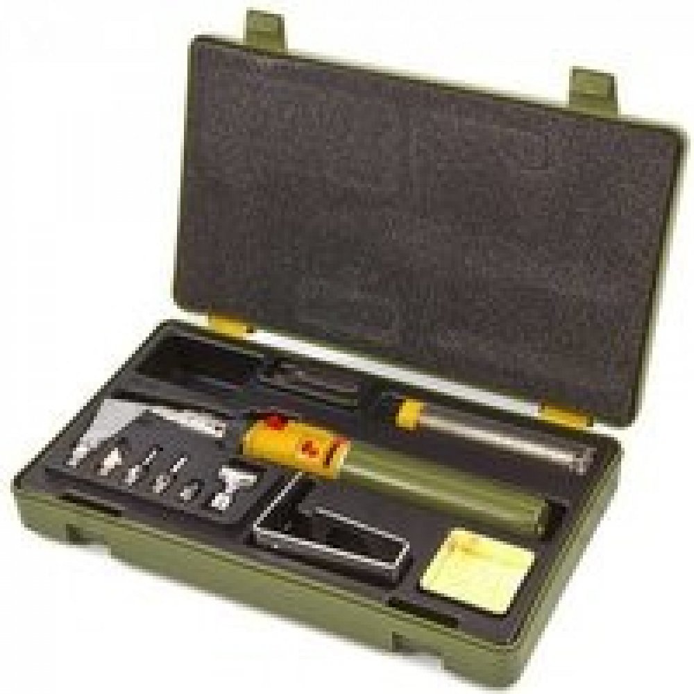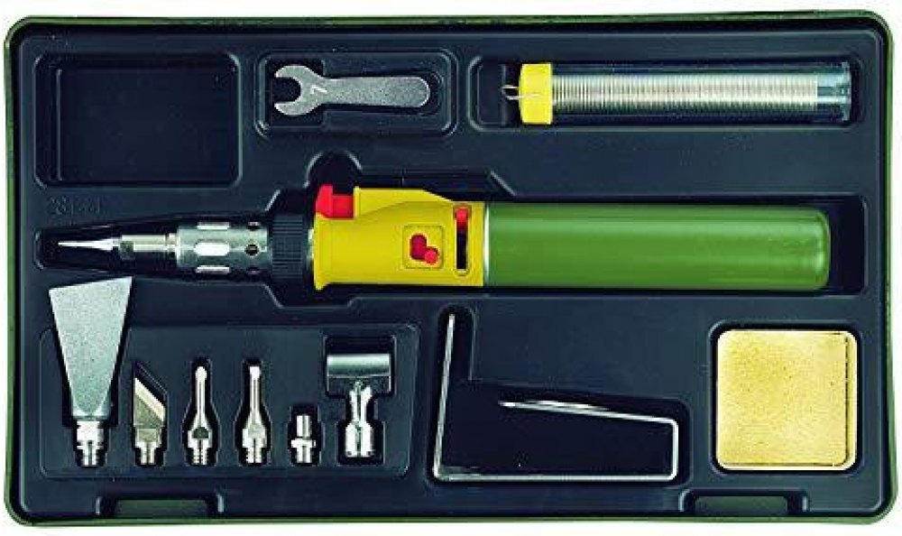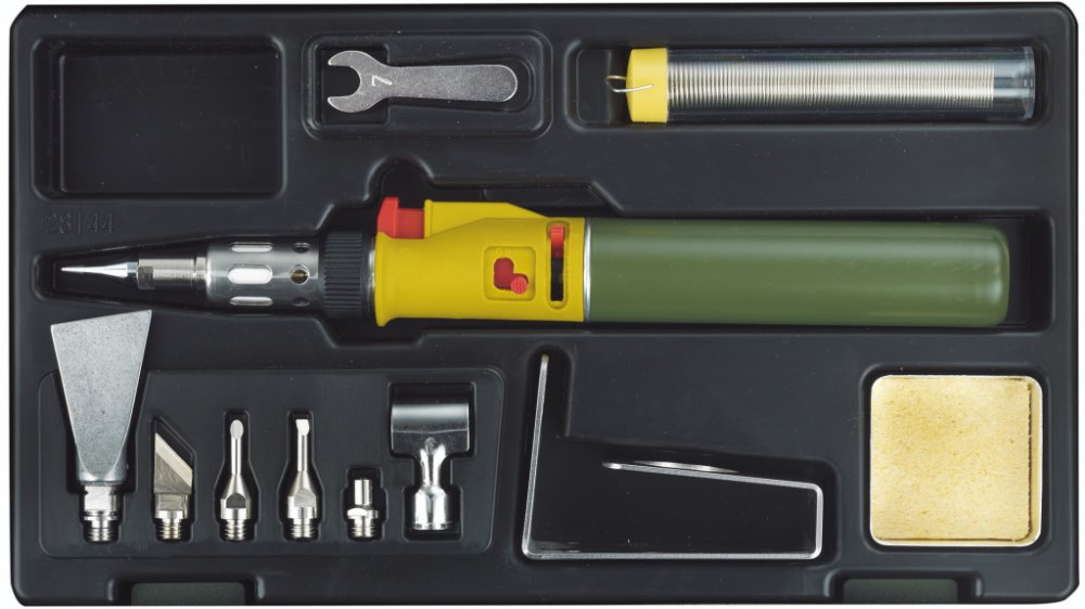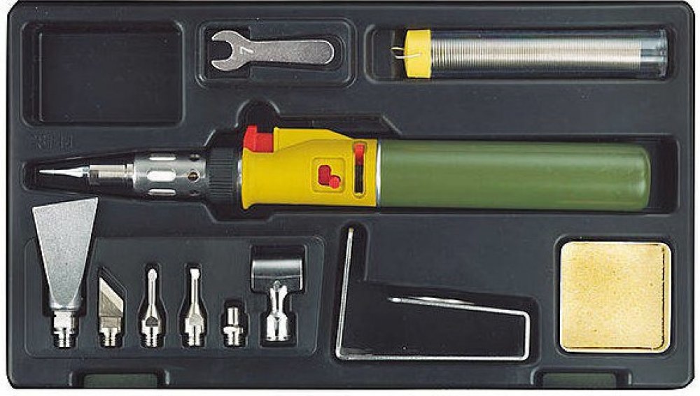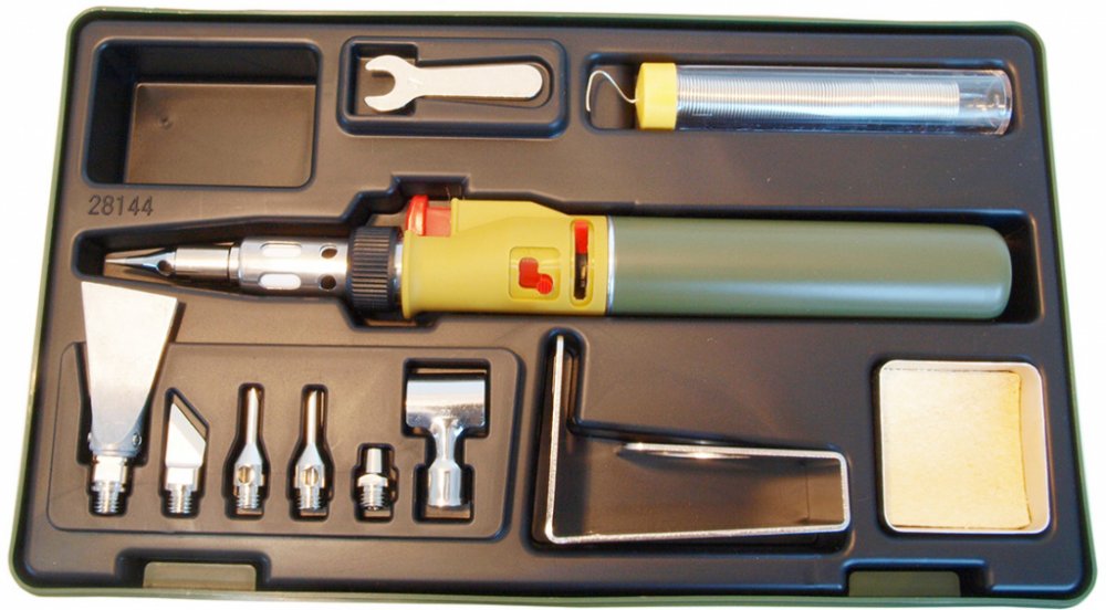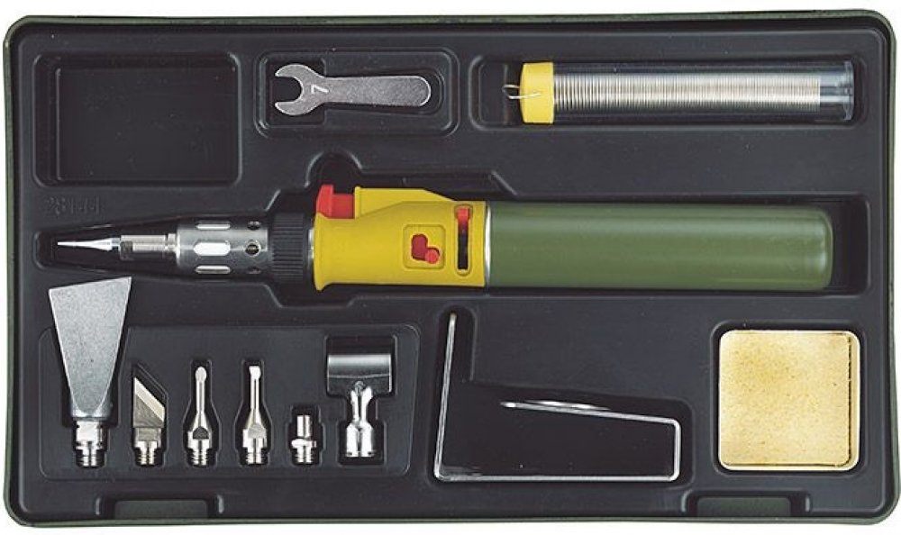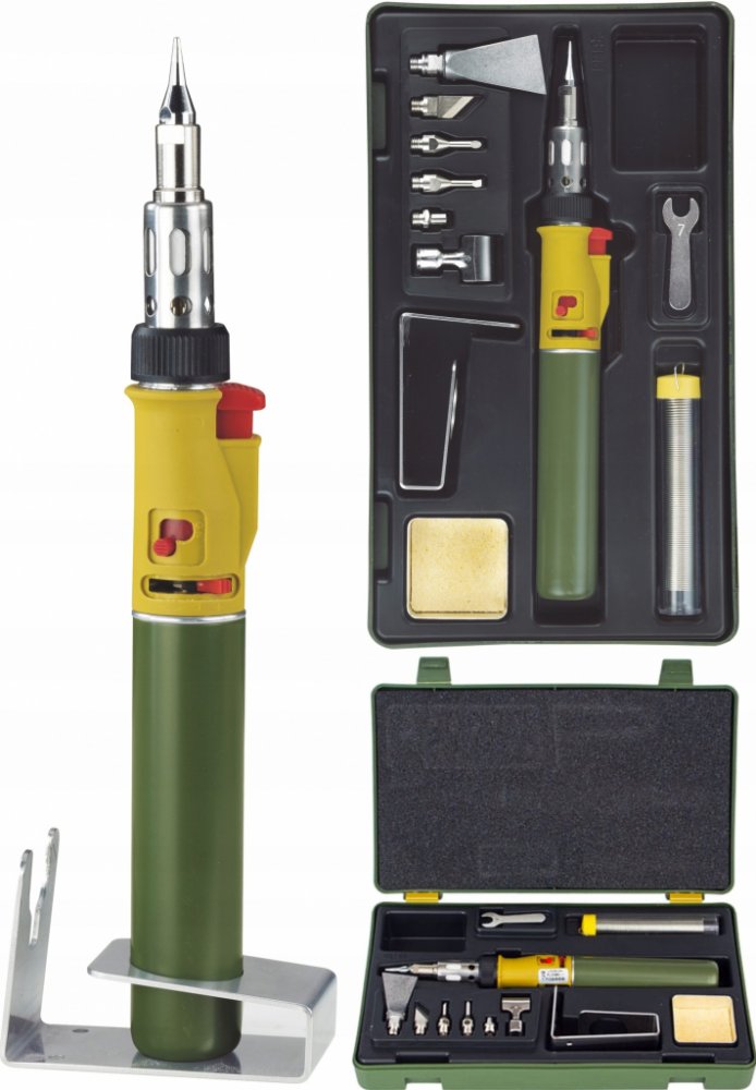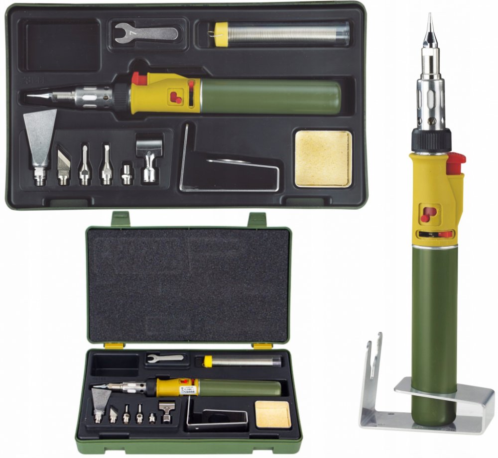 Součástí sady je 1ks cínového drátu v plastové tubě, 1ks odkapávací miska s čistící houbou, 1ks klíče vel. 7mm na utahování matice adaptérů. Dále sada obsahuje praktický stojan z nerezové oceli pro stacionární práci s pájkou nebo ve vodorovné poloze. Vše je baleno v plastovém kufříku, kde má každý kus své místo.