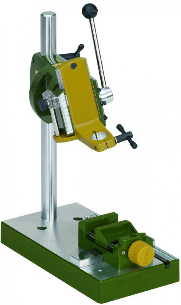 • Hlava výložníku s frézovaným rybinovým vedením je otočná až o 90° (se stupnicí). Umožňuje šikmé vrtání a mnohostranné frézování. Lehce ovladatelný hřebenový posuv s vratnou pružinou. S praktickým hloubkovým dorazem s možností nastavení max. do 40 mm. 20 mm objímka pro upnutí frézovacích a vrtacích strojů MICROMOT. Masivní pochromovaný ocelový sloup (280 x 20 mm). Vyložení osy stroje od sloupu je 140 mm. Rovinně frézovaný stůl (220 x 120 mm) s paralelním dorazem a stupnicí. Upevňovací otvory v základní desce na přišroubování např. MICRO křížového stolu KT 70. Otvory též na upevnění stojanu k pracovní desce. Hmotnost 2,2 kg.