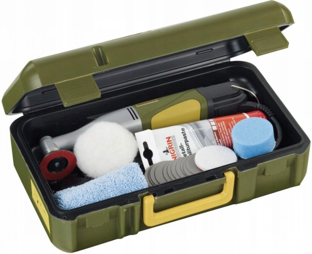 Součástí dodávky je 1ks gumový podpůrný kotouč 50 mm se suchým zipem, 1ks lešticí houba (středně tvrdá), 1ks kotouč z jehněčího rouna, 1ks filcový kotouč pro leštění kovů a neželezných kovů (střední tvrdost), 12ks brusných kotoučů (hrubost 2000), 1ks lešticí pasta (75 ml) a 1ks hadřík z mikrovláken.