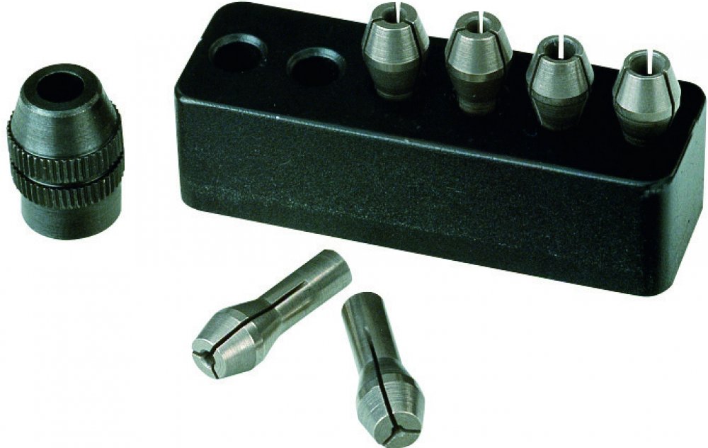 Součástí balení je 6 kleštinových pouzder pro stopky 1 – 1,5 – 2 – 2,4 – 3 a 3,2 mm; 1ks převlečná matice, 1ks držák pro umístění kleštin.