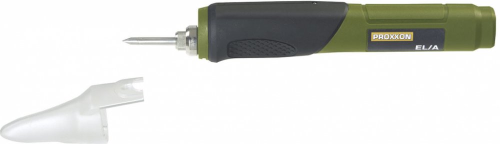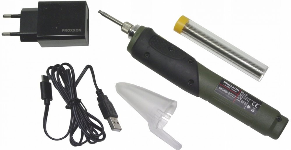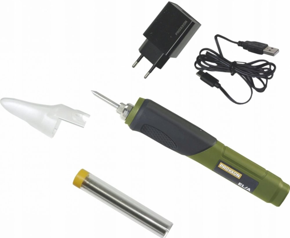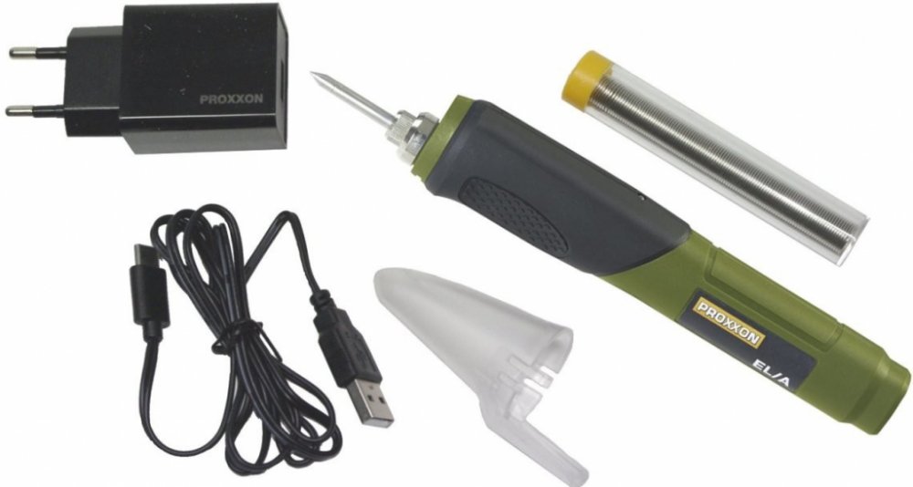 Elektronicky řízená teplota a krátká doba zahřívání. Akumulátorová pájka Proxxon EL/A je určena pro pohodlné pájení nezávislé na 230V síti. Elektronicky řízená teplota (470°C) a krátká doba zahřívání. Extra velká kapacita baterie (2,0 Ah), která se nabije za cca jednu hodinu. Rychlo nabíječka s USB konektorem (micro USB na druhé straně). Světlo pro osvětlení pracovního prostoru. Technická data / Specifikace: 3,6V. Baterie: 2,0 Ah. Nabíječka: 2,1 A. 470 °C. Hmotnost 120g. USB port/micro USB. Nabití za cca1 hod. Součástí dodávky je ochranný kryt pájky, rychlonabíječka (2,1A), cínový drát.