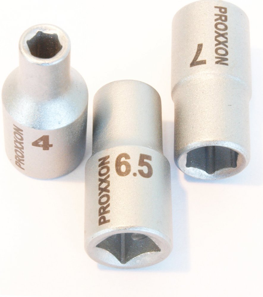 Šestihranné hlavice Proxxon jsou určené pro plně profesionální použití s 25 letou zárukou na materiál. Hlavice jsou vyráběny metodou tzv. studeného kování, které umožňuje použití chrom-vanadiové oceli 31CrV3. Většina výrobců uvádí označení pouze CrV, což je mnohem horší materiálové provedení! Díky kvalitní oceli, která je použita při výrobě, mají hlavice vyšší tvrdost a mohou mít tenké stěny (užší než konkurence), které usnadňují práci na nepřístupných místech. Skosení horní hrany ulehčuje nasazení na hlavu šroubu. Utahovací momenty a rozměrová přesnost je lepší než předepisuje DIN/ISO. Na každé hlavici je laserem ztřetelně označena velikost. Povrchová ochrana hlavice proti korozi se skládá ze dvou vrstev niklu a následné vrstvy matného chromu. Ve čtyřhranu jsou vyfrézované drážky, zabezpečující pevné uchycení na ráčně.