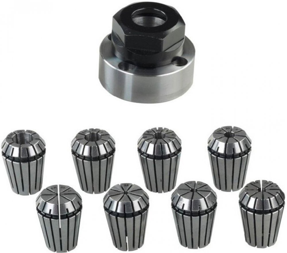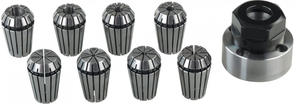 Sada kleštin ER 20 je určena pro maximální přesnost vystředěného běhu. sada obsahuje kleštiny v rozpětí 2 – 10 mm určených pro obrábění kulatých dílů s vysokou přesností. Upínací pouzdro (namontuje se na místo sklíčidla). V sadě je 8 průmyslových kleštin velikosti 2 – 2,5 – 3 – 4 – 5 – 6 - 8 a 10 mm.