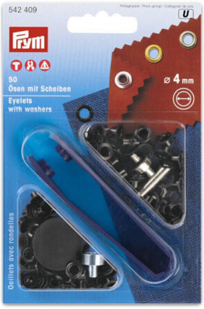 Průchodky kovové PRYM Klasická očka s podložkami, která poslouží jako jednoduchý dekorativní prvek jakýmkoliv oděvům. Očka jsou vyrobena z mosazi a jsou k dispozici v různých barvách a rozměrech. Všechny průchodky lze aplikovat kladivem nebo přiloženým aplikátorem. Aplikace: Průchodky o průměru 4 a 8 mm obsahují aplikátor a nástavce pro kleště Vario nebo trojnožku, dále je možné je aplikovat kladivem. Průchodky o průměru 11 a 14 mm obsahují aplikátor a dále je možná aplikace kladivem. Nelze je aplikovat kleštěmi ani trojnožkou. Věnujte prosím pozornost ikonkám na obalu průchodek, zda jsou určené pro aplikaci kleštěmi, trojnožkou či pouze kladivem. Kladivem je zároveň možné aplikovat všechny průchodky. Obsah balení: Průměr 4 mm = 50 kusů průchodek + aplikátor + nástavce Průměr 8 mm = 24 kusů pruchodek + aplikátor + nástavce Průměr 11 mm = 15 kusů průchodek + aplikátor Průměr 14 mm = 10 kusů pruchodek + aplikátor