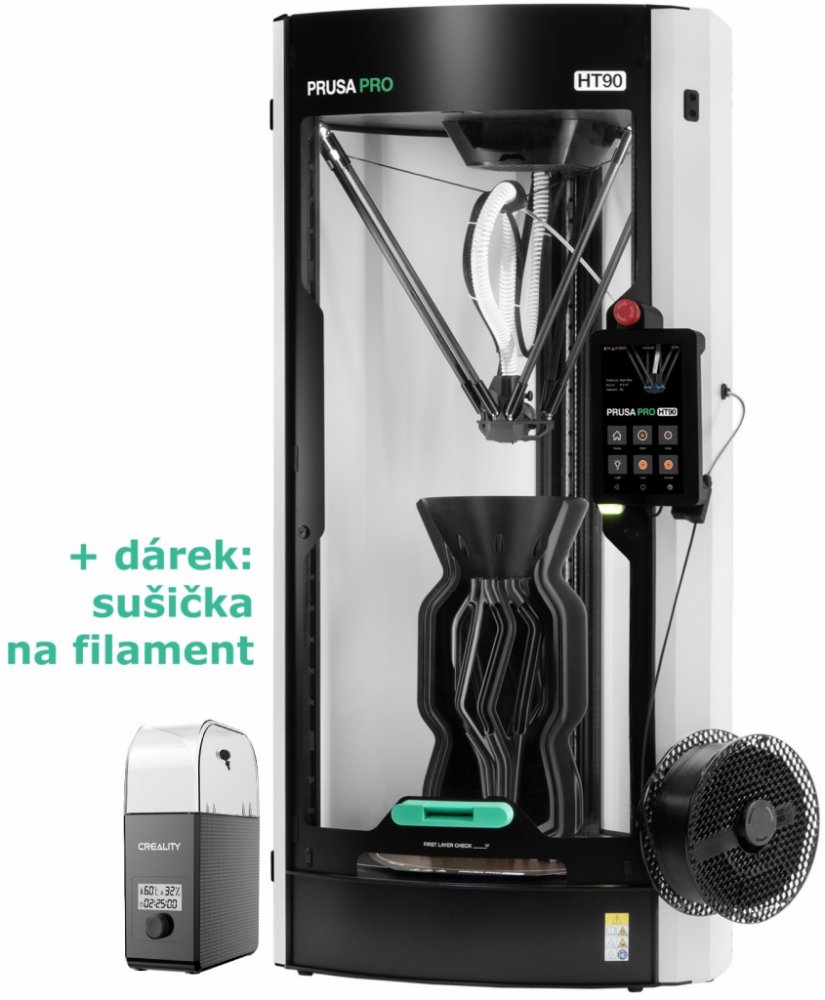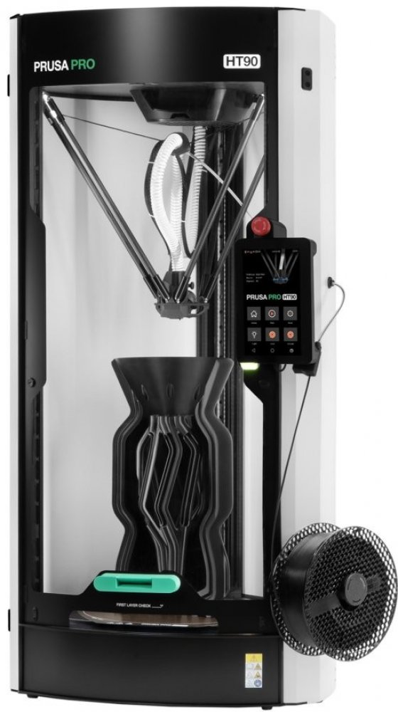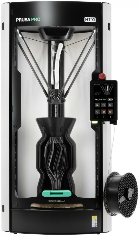 Prusa Pro HT90 je 3D tiskárna s delta kinematikou a cylindrickou tiskovou plochou (Ø300 × 400 mm). Je speciálně navržena pro dosažení těch nejlepších výsledků u pokročilých materiálů, jako jsou ABS, ASA, PCCF a PA. Vyhřívaná komora, která dosahuje až 90 °C, a inovativní chladicí systém poskytují bezkonkurenční přilnavost vrstev a kvalitu tisku.