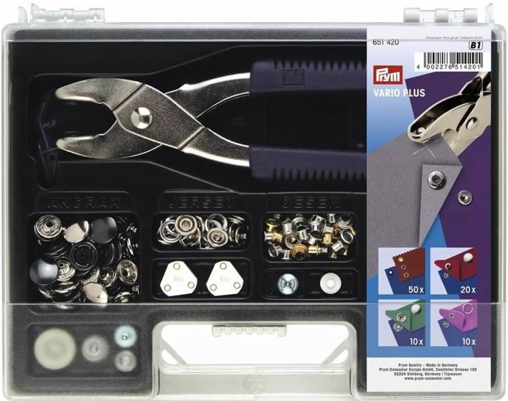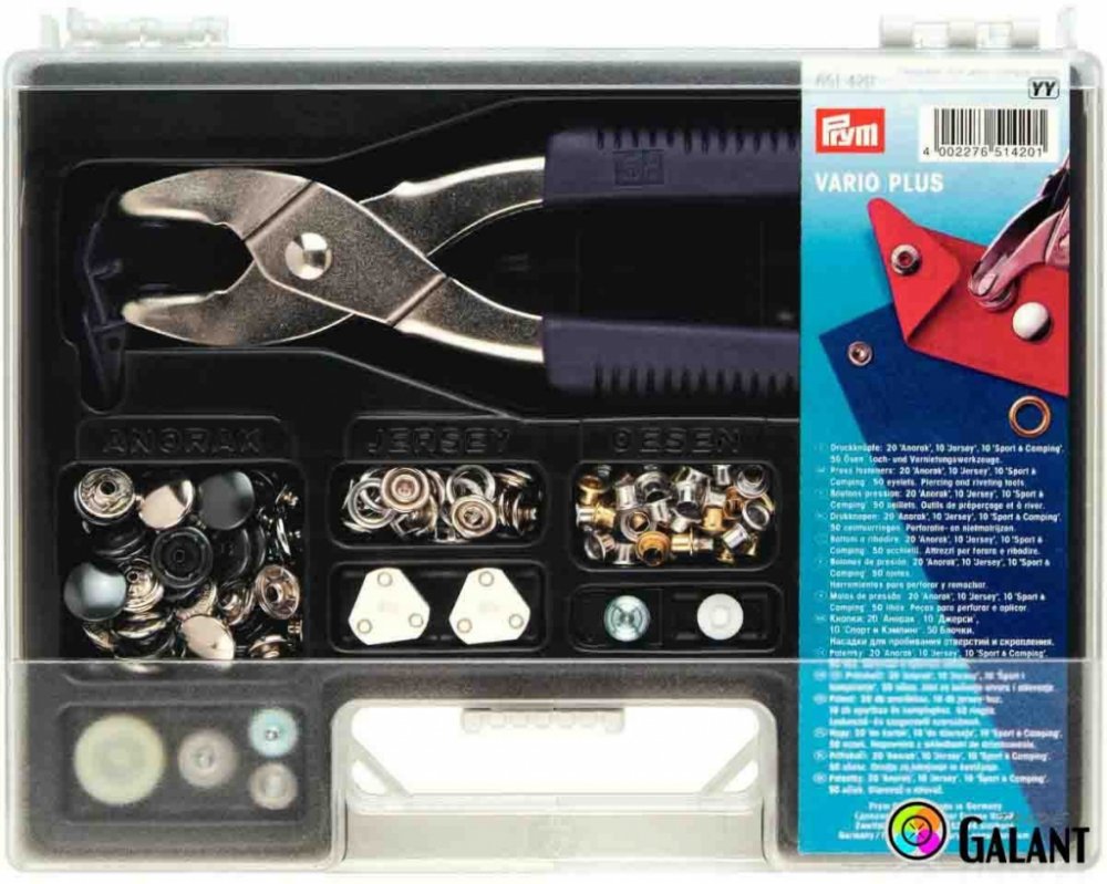 Sada VARIO PLUS - kleště, druky a průchodky v kufříku - PRYM je sada, ve které najdete vše, co můžete v domácnosti potřebovat! Vypadl Vám na bundě druk? Potřebujete na dětské triko nebo body nanýtovat baby druky? Ušili jste mikinu nebo tepláky a potřebujete průchodky na šňůrky? S kleštěmi VARIO to jde opravdu snadno a navíc je nyní můžete mít v sadě se sortimentem, který zaručeně využijete! Kufřík obsahuje: kleště Prym VARIO děrovací a nýtovací nástroje pro zpracování přiložených druků, cvočků, knoflíků a oček 10x druk Anorak/WUK 15 mm stříbrné barvy (390301) 10x druk Anorak/WUK 15 mm stiskací knoflík černý lesk (390230) 10x druk Sport & Camping 15 mm stříbrné barvy pro sportovní účely a pevné materiály (390202) 10x cvoček Jersey 10 mm s ozubeným kolečkem stříbrné barvy 25x nýtovací průchodky 4 mm stříbrné barvy 25x nýtovací průchodky 4 mm zlaté barvy Ilustrovaný návod Délka kleští: 20 cm Tento produkt můžete využít jako: kufřík na šicí potřeby, košík na šicí potřeby, zásobník na šicí potřeby, kazeta na šicí potřeby i jako úložný box na šicí potřeby.