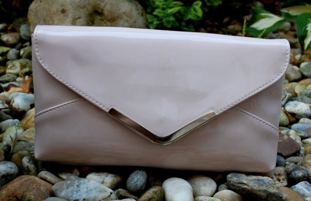 Luxusní pudrová růžová pěkná kabelka pevného tvaru ve tvaru obálky z lakované ekokůže, stříbrné kování, lakované dlouhé ramínko, preklápačka na magnet.