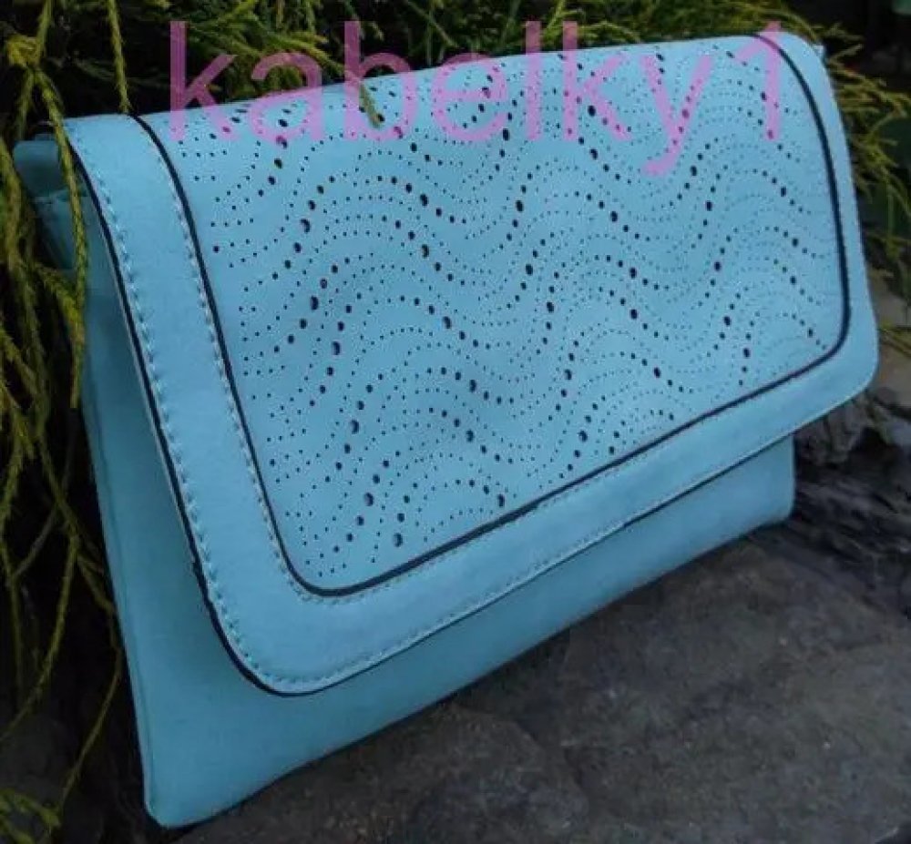 Preklápačka perforovaná pod ní třpytivá látka v barvě kabelky.