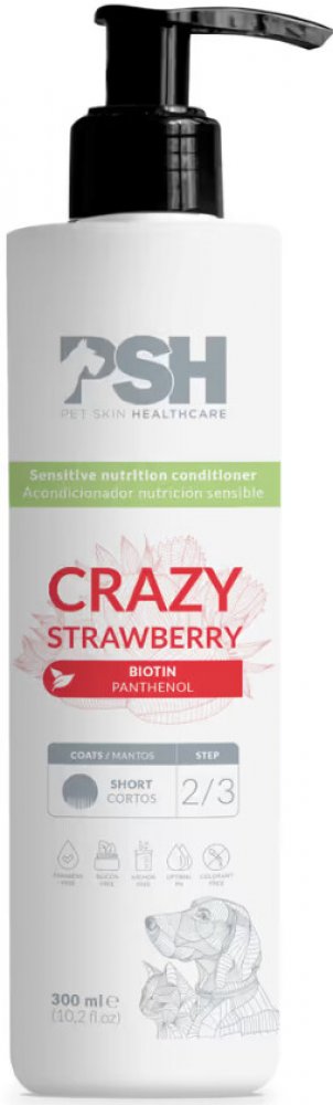 pro každou barvu a typ srsti - s biotinem, niacinamidem, pyrodixinem a keratinem - s vůní sladkých, šťavnatých jahod - bez parabenů, bez silikonu, bez kathonu Použití: Kondicionér naneste na vlhkou srst psa umytou šamponem, rovnoměrně vmasírujte, nechte chvíli působit a srst pročešte, poté důkladně opláchněteObjem: 300mlPSH kosmetika je vysoce kvalitní kosmetika pro mazlíčky vyráběná ve Španělsku Vhodné pro psy všech plemen včetně štěňat od 4 měsíců věku, vhodné i pro kočkyNejlepší pro psa - pečujeme o Vašeho mazlíčka s láskou