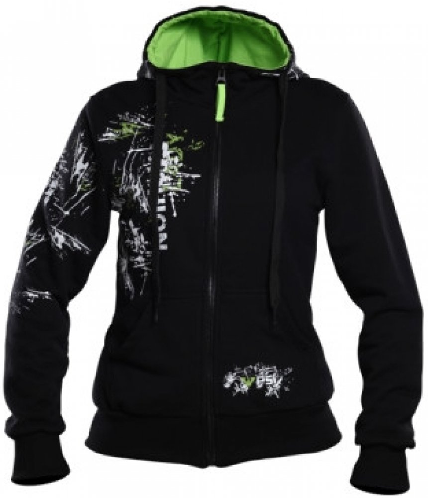Dámská mikina PSí Fashion Lady Nová mikina firmy PSí Hubík v dámském provedení z příjemného bavlněného nepodčesaného úpletu černé barvy. Délka rukávu a těla ukončena pružným patentem. Zapínání na zip s plastovými zoubky a celokovovým jezdcem v atraktivním vzhledu. Na předních dílech hluboké kapsy na obsah. Stylová grafika barevně sladěná s vypodšitou kapucí doplňuje související produkt nátělník DI...
