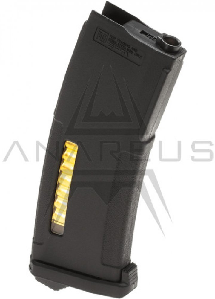Díky tělu z extrémně odolného DuPont Zytel polymeru vydrží i tvrdé zacházení na bojišti a je vhodný i pro výcvik. Při vystřelení poslední kuličky ze zásobníku vyskočí oranžový podavač, který vám signalizuje prázdný zásobník, což uvidíte skrze otevřené okénko výhozu nábojnic přesně jako u ostrých zbraní. Tlačná pružina a jezdec (follower) jsou špičkové kvality a umožňují spolehlivě fungovat na extrémních kadencích nebo v DMR puškách s těžkým střelivem až 0,49 g bez rizika zaseknutí nebo pomalého podávání.