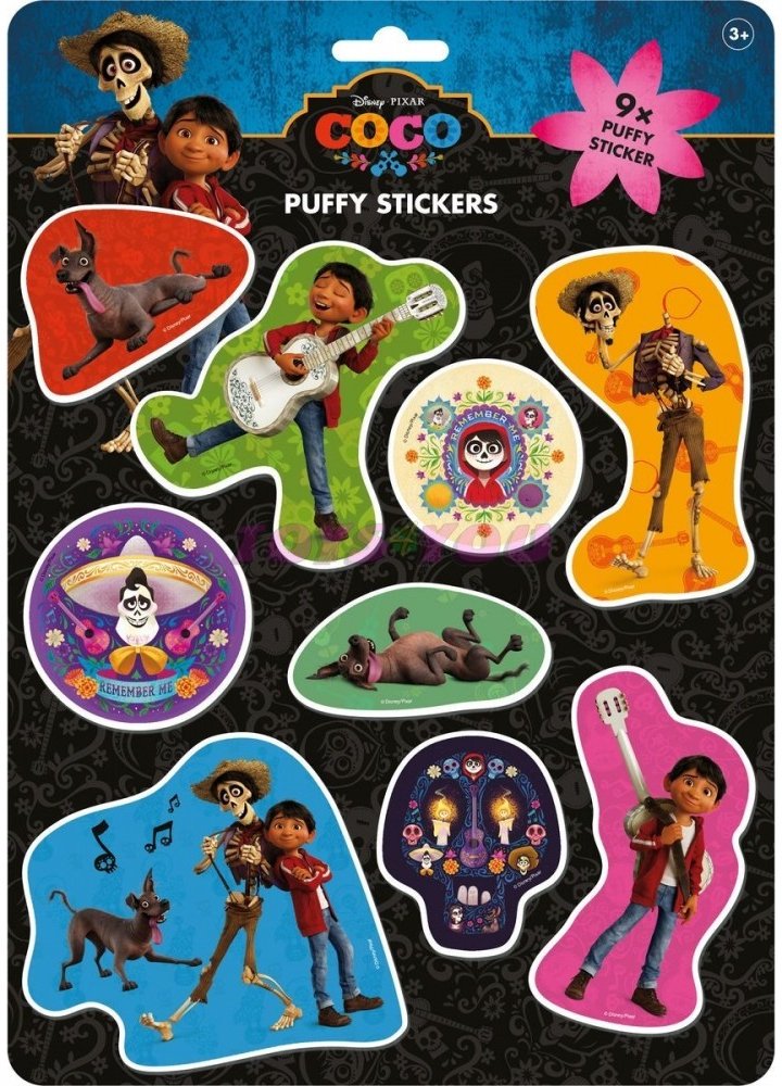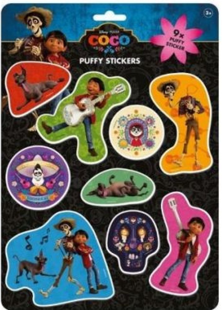 Zábavné a veselé 3D samolepky s obrázky Coco.Sada devíti úžasných plastických puffy samolepek s motivy z animovaného filmu Coco.
