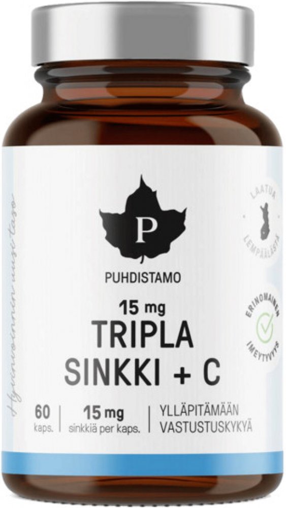 Puhdistamo 60 tbl kapsle imunita Puhdistamo pro dospělé perorální od 3 let bez příchutě Finsko zinek imunita a obecné zdraví 60 15.0 mg Kdykoliv 1 za den Suché místo + pokojová teplota, Chránit před světlem/sluncem, Mimo do… s vitamínem C