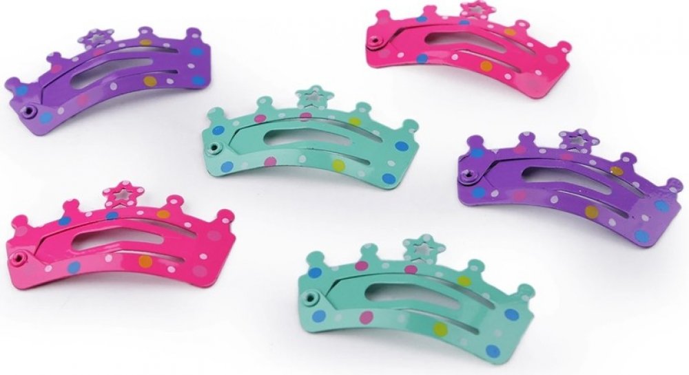 Na papierovej karte je 6 ks sponiek po 3 pároch vytvarovaných do podoby kráľovskej korunky . Sponky sú vyrobené z kvalitného materiálu, ktorý dlho drží svoj tvar, funkčnosť aj farby. Karta je opatrená výsekom na zavesenie a vystavenie na predajný stojan.