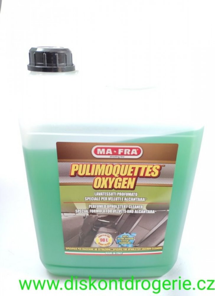 Vysoce koncentrovaný výrobek s potlačenou pěnivostí, který dokonale a do hloubky vyčistí jakoukoliv tkaninu, samet či koberec. Před použitím prostředku si vždy přečtěte označení a informace. Vysoce koncentrovaný výrobek s potlačenou pěnivostí, který dokonale a do hloubky vyčistí jakoukoliv tkaninu, samet či koberec. Pulimoquenttes oxygen, díky svým vlastnostem, dosahuje vynikajících výsledků při p...