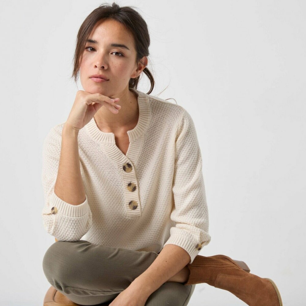Pulovr s výstřihem na knoflíky a perličkovým vzorem režná