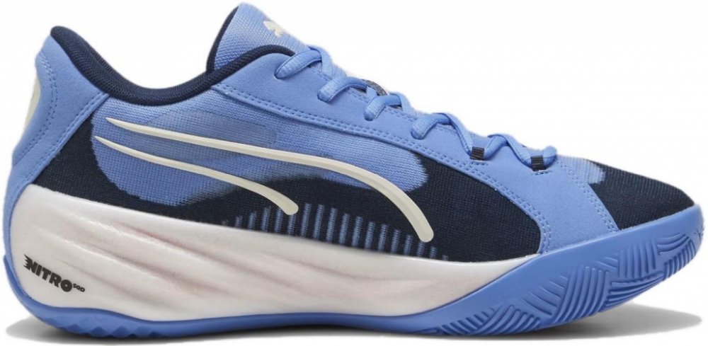 PUMA?All-Pro Nitro „Blue Skies/Club Navy“ – nízkoprofilová basketbalová obuv s reaktivní Nitro SQD pěnou a prodyšným mesh svrškem v modrém barevném provedení. PUMA All-Pro Nitro „Blue Skies/Club Navy“ (kód 309688-01) spojují moderní design s technologií Nitro SQD – měkké jádro pěny pro komfort a tužší vnější vrstva pro stabilní dynamické pohyby. Svršek z prodyšného engineered mesh materiálu podporuje ventilaci a přilnavost, zatímco plná gumová podrážka s multi-směrovým vzorkem drží na čistých i lehce znečištěných kurtech.