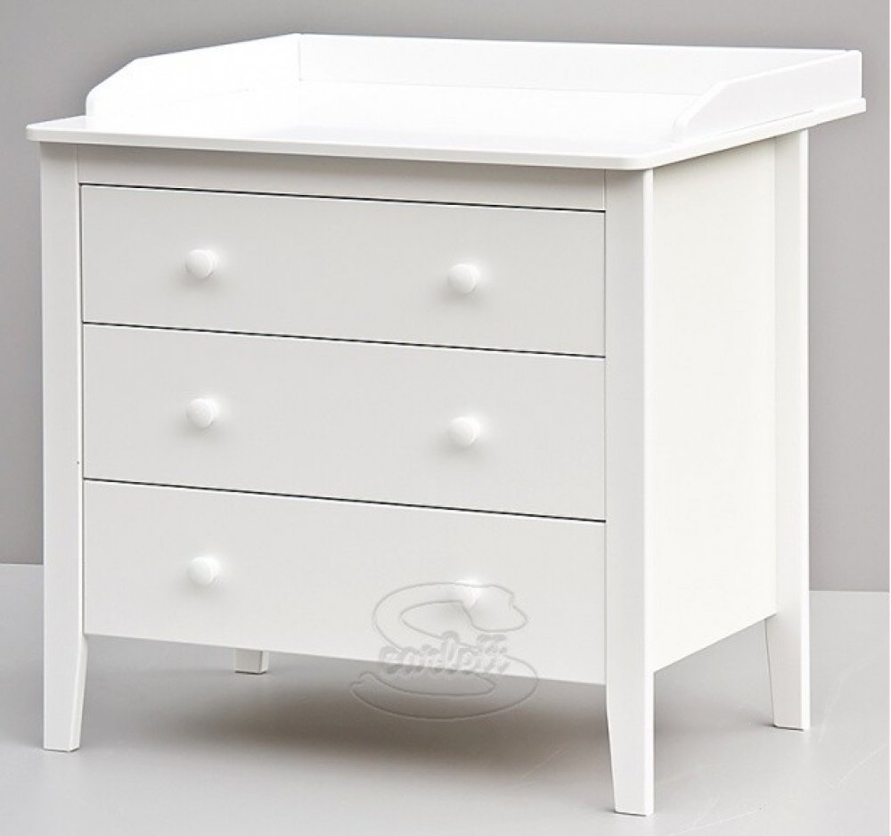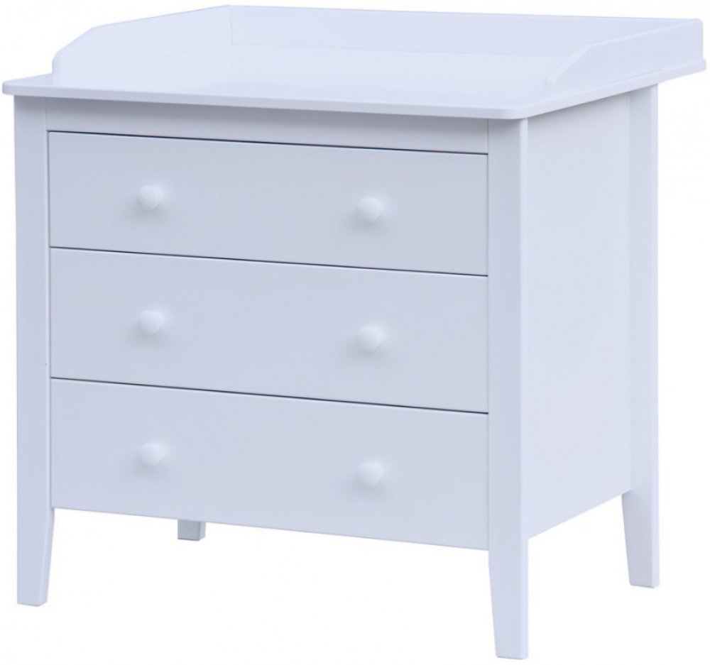 Bílá komoda je vyrobena z bukového dřeva, laminátu a MDF. Přeblovací pult je možné oddělit. Komoda obsahuje 3 prostorné šuplíky. Komoda je velmi robustní, proto není třeba dalšího jištění proti převrácení.