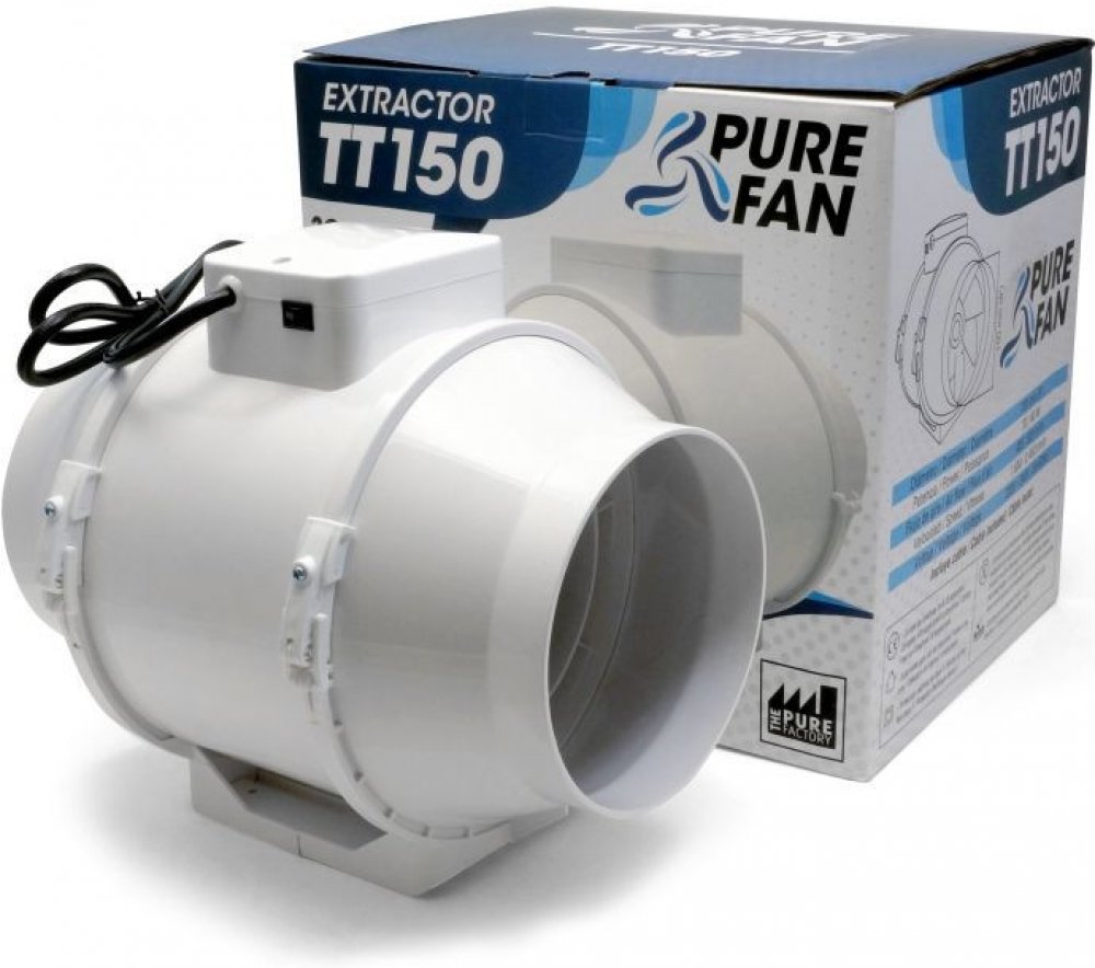 Dvojrychlostní potrubní axiální ventilátor z ABS plastu Pure Fan TT 150 mm se hodí pro kruhová potrubí a menší ventilační systémy. Předností je minimální hlučnost a nízká hmotnost. Ventilátor má zabudovaný kabel.