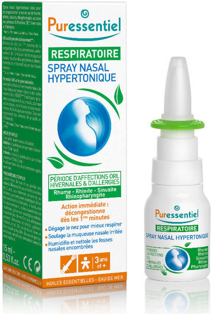 - Puressentiel - PURESSENTIEL Nosní sprej 15 ml - Kosmetika, hygiena a péče | Aromaterapie - K uvolnění dýchacích cest, při nachlazení, rýmě, alergií. Zklidňuje a zvlhčuje podrážděnou nosní sliznici a zmírňuje příznaky nachlazení. 100% přírodní původ. Kombinace hypertonické mořské vody a organické vody z rozmarýnových květu s EOBBD*** esenciálními oleji (ravintsara, růžová pelargonie, eukalyptus r...