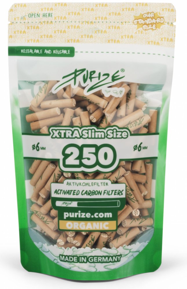 PURIZE® XTRA Slim Size filtry jsou určeny pro všechny, kteří preferují extra tenké filtry s aktivním uhlím. S průměrem 6 mm a délkou 27 mm jsou ideální pro ručně balené cigarety. Vyrobeny z vysoce kvalitního aktivního uhlí na bázi kokosových skořápek, které účinně snižuje množství škodlivých látek a poskytuje chladný, suchý a aromatický zážitek z kouření. Obě koncové části filtru jsou vyrobeny z keramiky, což eliminuje nutnost sledovat směr vložení a usnadňuje manipulaci. Filtry jsou baleny v praktickém, znovu uzavíratelném balení obsahujícím 250 kusů, které chrání filtry před vnějšími vlivy a zajišťují jejich dlouhou trvanlivost. PURIZE® filtry jsou vyráběny z ekologických surovin v Německu. Výhody: - vhodné pro všechny ručně balené cigarety - výrazně jemnější zážitek z kouření - vysoká kvalita aktivního uhlí - nejlepší filtrační vlastnosti - ekologické a udržitelné - vyrobeno v Německu Rozměry: - průměr: 6 mm - délka: 27 mm Balení: 250 kusů