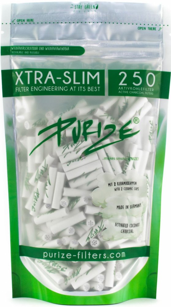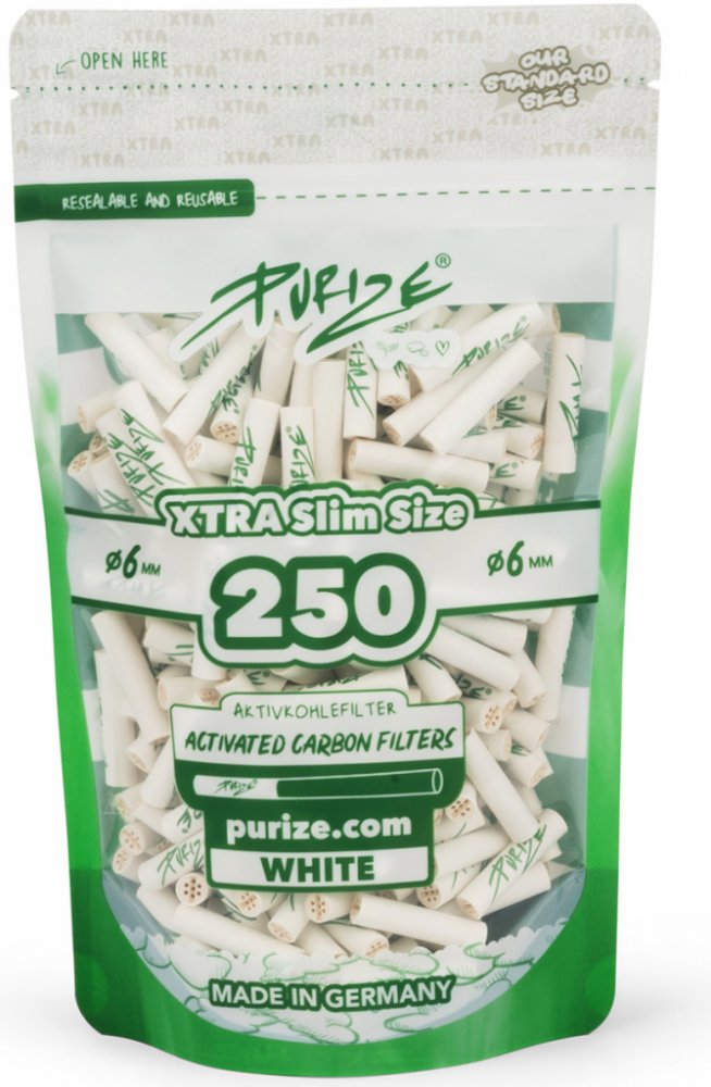 PURIZE® XTRA Slim Size filtry jsou určeny pro všechny, kteří preferují extra tenké filtry s aktivním uhlím. S průměrem 6 mm a délkou 27 mm jsou ideální pro ručně balené cigarety. Vyrobeny z vysoce kvalitního aktivního uhlí na bázi kokosových skořápek, které účinně snižuje množství škodlivých látek a poskytuje chladný, suchý a aromatický zážitek z kouření. Obě koncové části filtru jsou vyrobeny z keramiky, což eliminuje nutnost sledovat směr vložení a usnadňuje manipulaci. Filtry jsou baleny v praktickém, znovu uzavíratelném balení obsahujícím 250 kusů, které chrání filtry před vnějšími vlivy a zajišťují jejich dlouhou trvanlivost. PURIZE® filtry jsou vyráběny z ekologických surovin v Německu. Výhody: - vhodné pro všechny ručně balené cigarety - výrazně jemnější zážitek z kouření - vysoká kvalita aktivního uhlí - nejlepší filtrační vlastnosti - ekologické a udržitelné - vyrobeno v Německu Rozměry: - průměr: 6 mm - délka: 27 mm Balení: 250 kusů