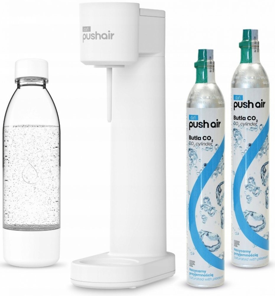 Výrobník Sody Dafi PUSHAIR je zařízení pro domácí přípravu perlivé vody podle vlastních chuťových preferencí. Jedná se o moderní sifon pro plynování vody, který učiní z obyčejné kohoutkové vody mimořádně osvěžující sodovou vodu. Díky saturátoru PUSHAIR se můžeme vyhnout nutnosti kupovat perlivou vodu v lahvích, což je pohodlné i ekologické. Saturátory PUSHAIR Dafi jsou také úsporné, protože můžete opakovaně používat stejné zařízení k přípravě různých sycených nápojů a snížit tak tvorbu PET odpadu.