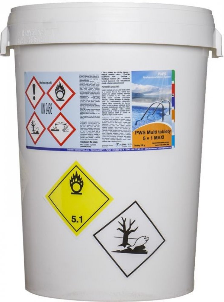 Tento produkt slouží k udržení požadované koncentrace volného chloru v bazénové vodě. Doporučená se koncentrace se pohybuje rozmezí 0,3 až 0,6 mg/l. Na rozdíl od jiných přípravků není nutné kontrolovat hodnotu pH, protože tyto tablety ji stabilizují. V prvním týdnu úpravy doporučujeme kontrolovat hodnotu chloru jednou za dva dny Po ustavení rovnováhy je doporučována kontrola chloru 1 až 2krát za 14 dní. Tableta se umisťuje do skimmeru, plováku nebo do dávkovače tablet. Jedná se o klasické tablety "5 in 1". Přípravek má tyto funkce: Udržuje hodnotu chloru; Zjiskřuje bazénovou vodu; vločkovačkuje; Stabilizuje hodnotu pH; Rozjasňuje vodu. Bazénová chemie, PWS Multi tablety 5 v 1 MAXI.