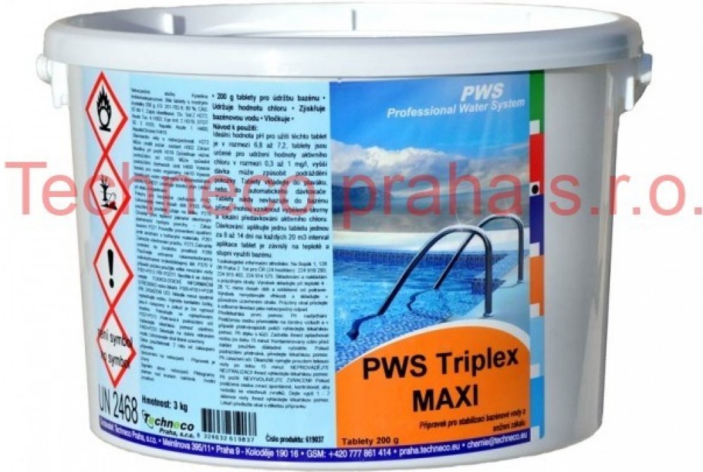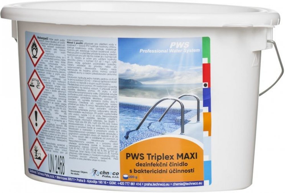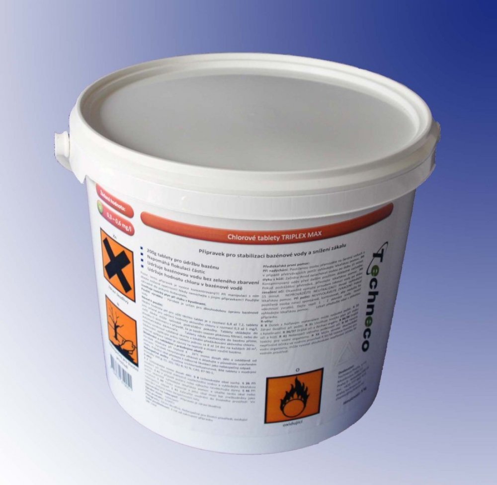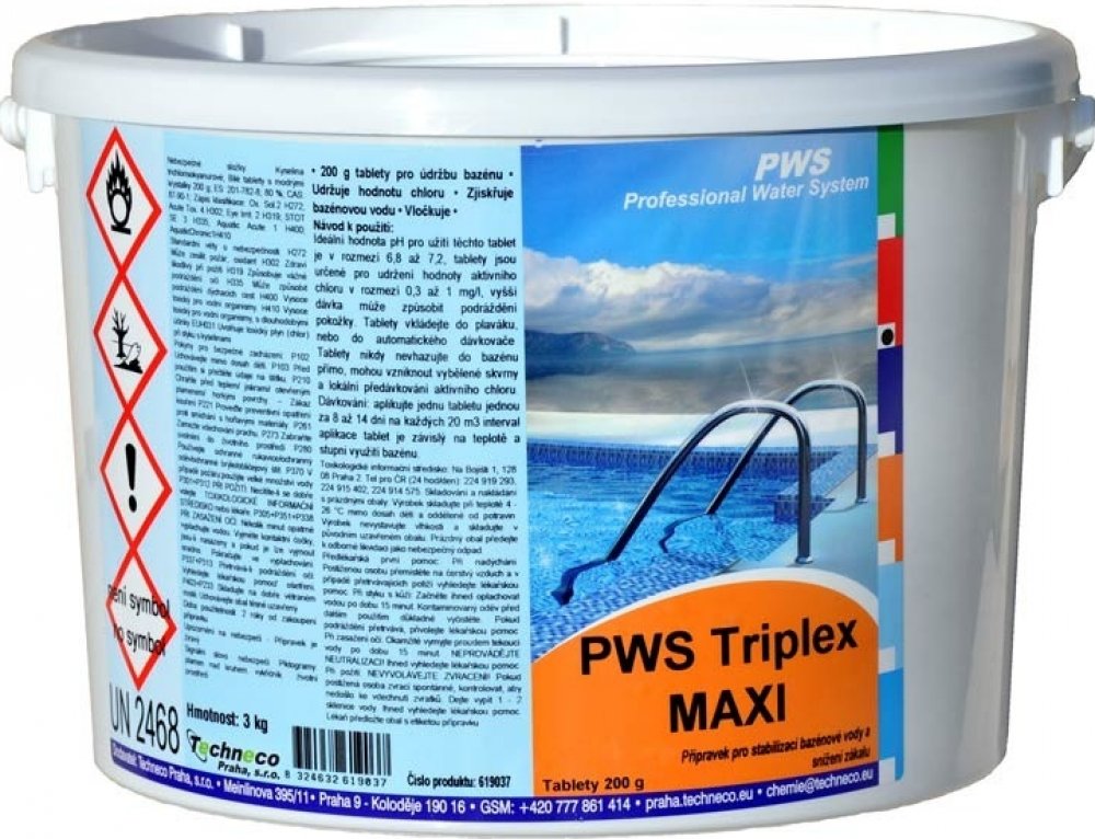 Tento produkt slouží k udržení požadované koncentrace volného chloru v bazénové vodě. Doporučuje se koncentrace 0,3 - 0,6 mg/l. Pro správnou funkci tohoto přípravku je klíčové udržovat hodnotu pH v intervalu 6,8 - 7,2. Koncentrace chloru a hodnota pH se doporučuje kontrolovat jednou za 2 dny v průběhu prvního týdne. Následně provádět stanovení 1 až 2krát za 14 dní. Tableta se umisťuje do skimmeru, plováku nebo do dávkovače tablet. Jedná se o klasické tablety "3in1". Bazénová chemie, PWS Triplex MAXI, 3kg...