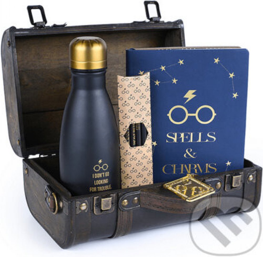 Krásný dárkový set pro fanoušky kouzelnického světa Harry Pottera v krásném precizně zpracovaném kufříku. Ten je vyrobený ze dřeva, potažen umělou kůží s kovovými doplňky a možností si díky odepínacího popruhu vzít kufřík přes rameno. To vše je pak doplněno namalovaným erbem Školy čar a kouzel v Bradavicích na čelní straně. V kufříku pak nalezneme stylovou láhev na pití (cca 350 ml), linkovaný A5 zápisník, kovovou klíčenku a 4 tužky.
