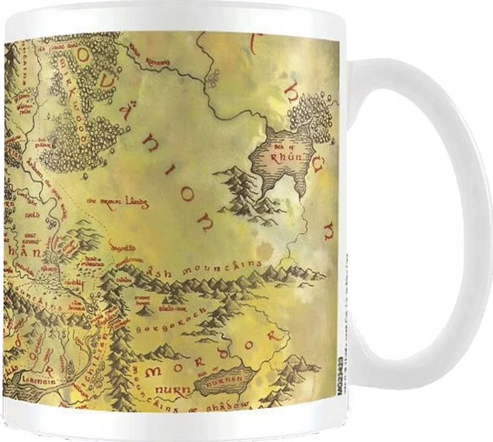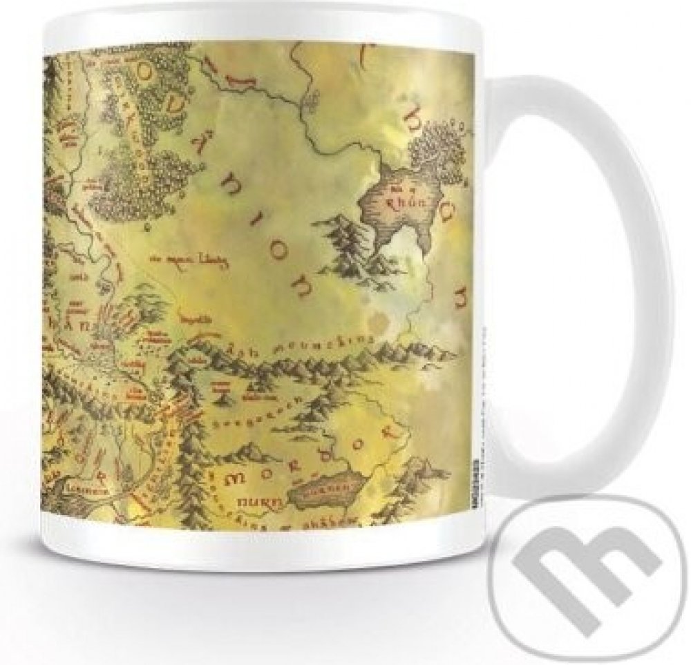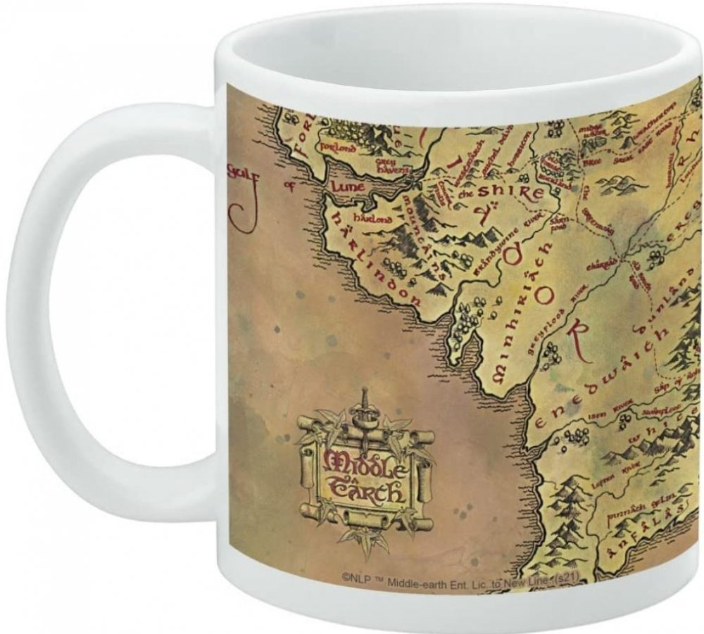Napijte se něčeho dobrého a nechte se unášet fantazií v krajích na mapě Středozemě ze světa Pána prstenů a Hobita, která zdobí tento pěkný hrnek.